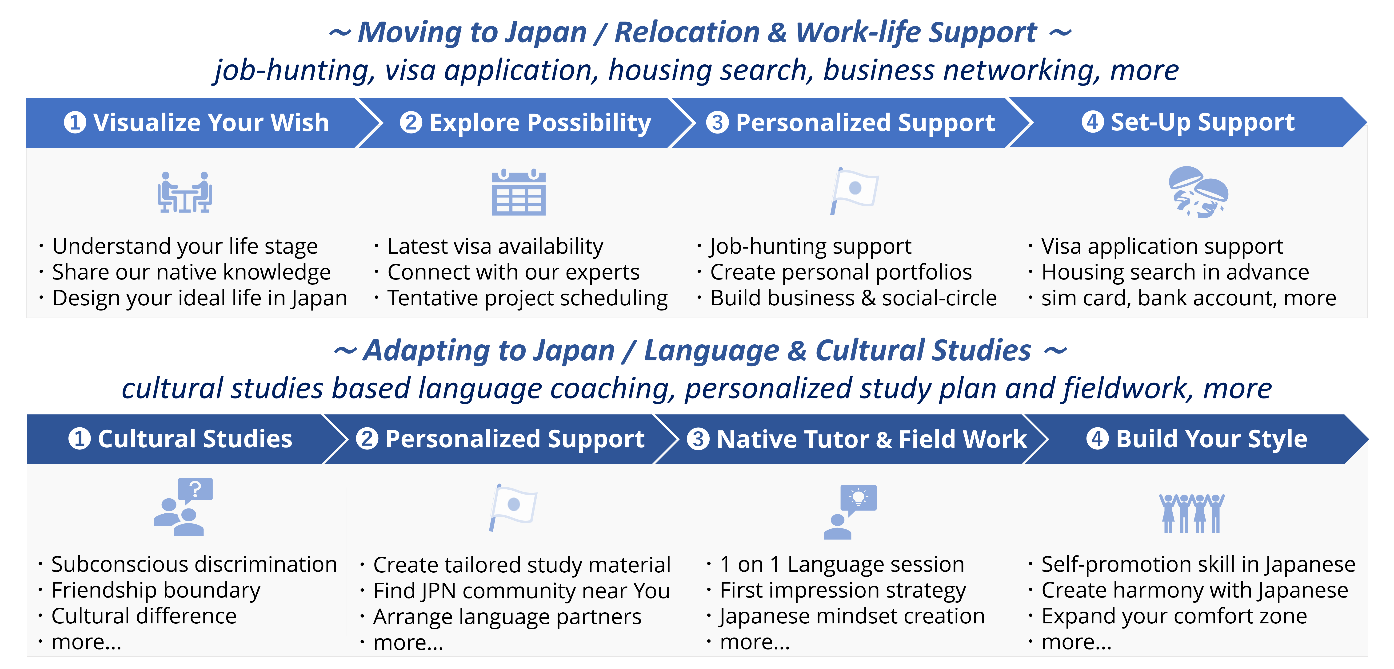 Business networking, Job hunting support, Private Language coaching, Visa consulting, Cultural studies, Housing & Akiya search