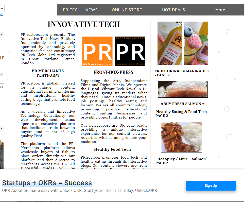 PR Tech Global promotes food technology and healthy eating through its interactive blogs on its eCommerce site PRfrostbox.com. Visit the blog which features simple Wild Salmon recipes, 100% fruit drinks, mixers, and marinades. PRfrostbox specialises in world speciality foods from Italy and produces its own branded soft drinks (Orange Sublime / Exotic Peach) and Fresh Seafood Meal Kits that can be made in under 8 minutes. Try their global Seafood Merchants Platform for bulk orders and get worldwide shipping. PRfrostbox can provide global logistic solutions via their eCommerce site with live CRM help-desk support. Talk with the friendly eCommerce team@PRfrostbox.com