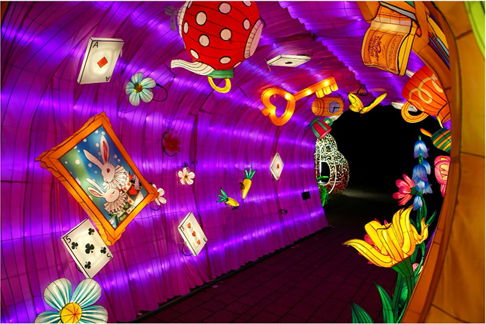 Highlighting the exhibition is the longest light and music tunnel in the United States that stretches 800 feet, featuring an extraordinary blend of lights and sounds. More than 78,000 state-of-the-art LED lights, supplied by US lighting manufacturer S4Lighting, are used to illuminate the tunnel. Over 80 3D-lighted figurine lanterns with a height up to 20 ft, 95 2D-lighted decorative configurations, and approximately 580,000 light points are used to illuminate the entire outdoor exhibition.