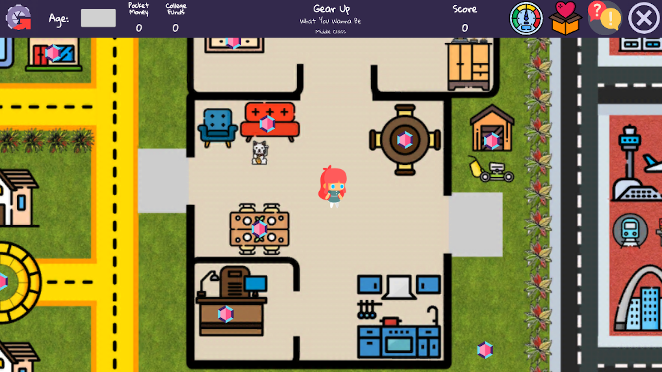 Players will have a limited number of turns (Time) to reach their goal. Players can earn good grades or show remarkable achievements in their choice of fields or get respectable job experience. College is not for everyone, and good grades are not the only ticket to success. Students can be successful by being good at something that they love. This game shows several places in the neighborhood where they can find help.