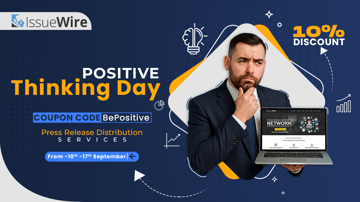 New York City, New York Sep 10, 2025 (Issuewire.com) - Positive Thinking Day is celebrated on September 13 every year to celebrate positivity in life that helps pave the path of success, and we are here to help you build the path. At IssueWire, business owners and individuals can leverage the celebration of positivity, as we are providing a massive discount of 10% on our Press release distribution services. This special sale offer is starting from September 10th, and it will empower our clients till September 17th, offering a fruitful opportunity to create an impactful buzz on Positive Thinking Day. Interested business and brand owners can take complete advantage of our sale by applying the Coupon Code BePositive at the time of purchase.