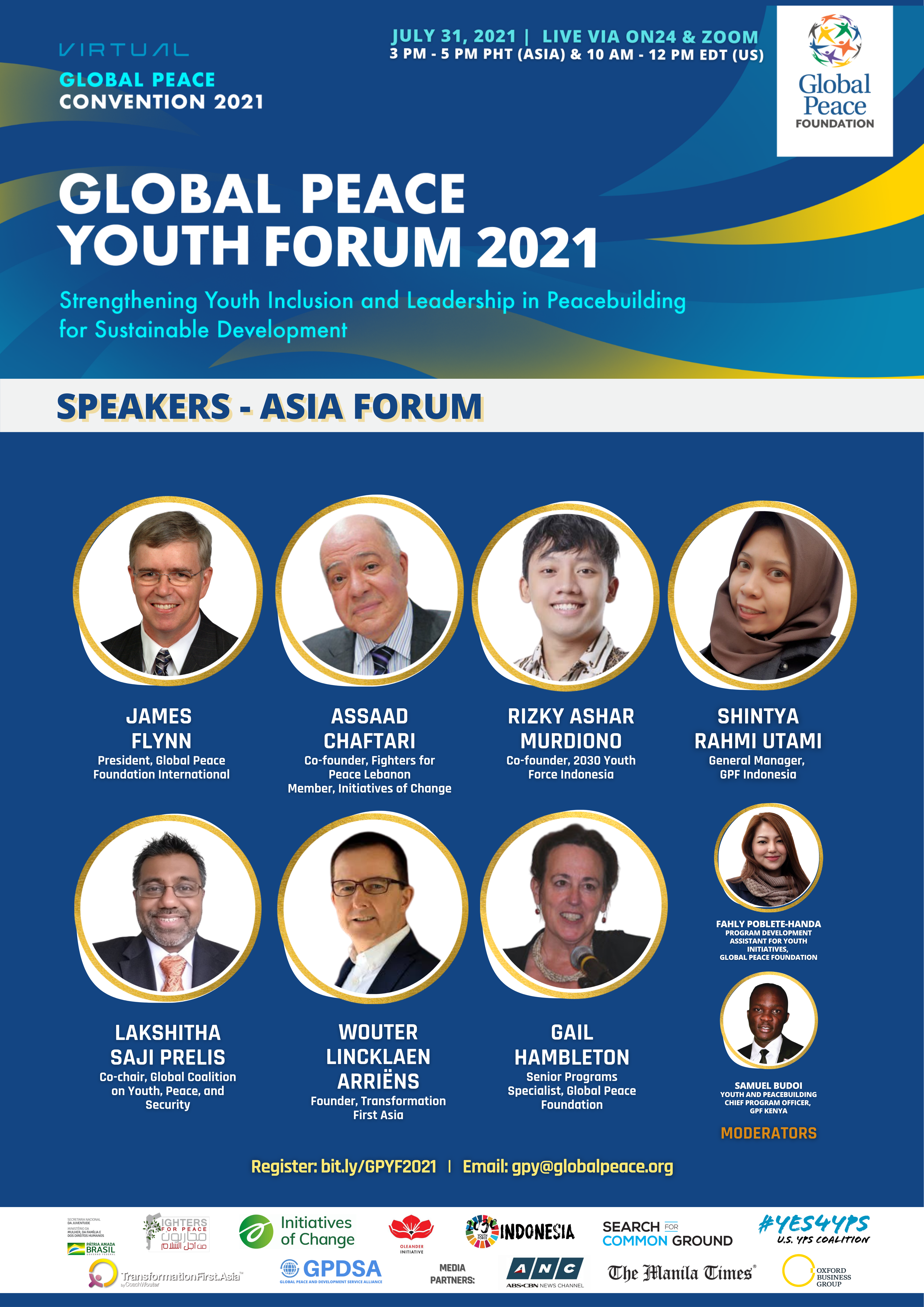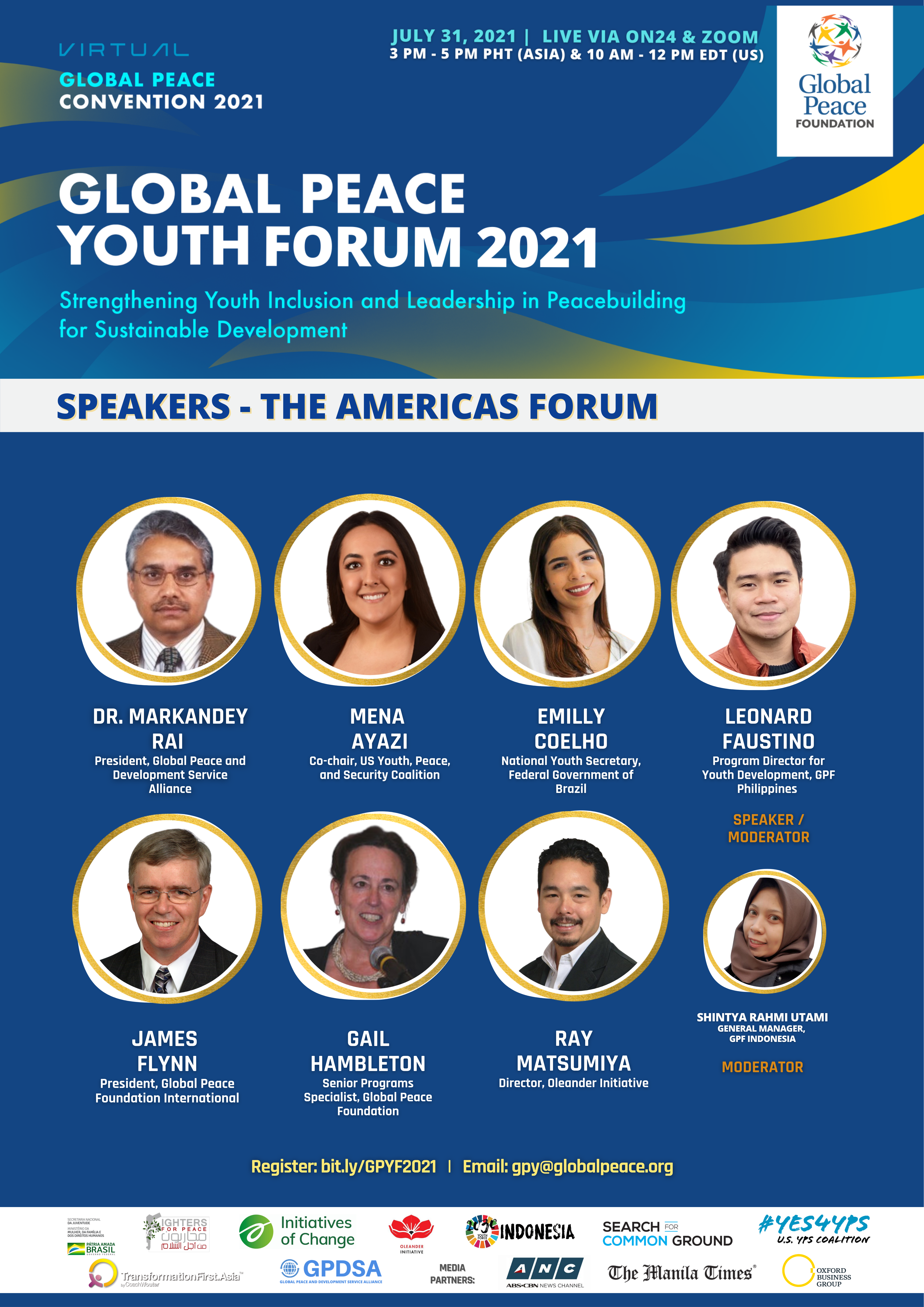 GPYF 2021 is organized in partnership with Secretaria Nacional da Juventude - Brazil, Fighters for Peace, Initiatives of Change, Oleander Initiative, 2030 Youth Force Indonesia, Search for the Common Ground, Youth, Peace and Security Coalition, Transformation First Asia, Global Peace and Development Service Alliance, ABSCBN News Channel, The Manila Times, and Oxford Business Group.