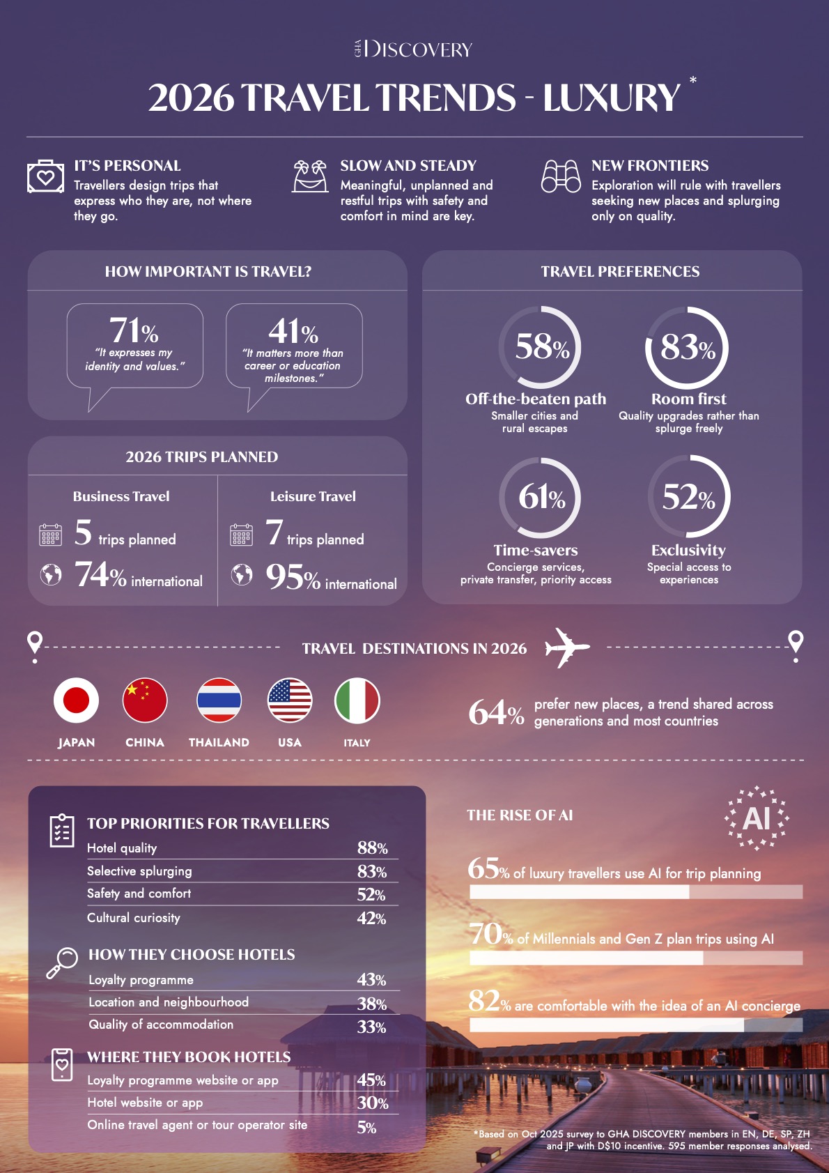Dubai, United Arab Emirates Dec 22, 2025 (Issuewire.com) - Global Hotel Alliance (GHA) has released its Luxury Traveller Profile for 2026, drawing on insights from the top 10% of spenders within its award-winning GHA DISCOVERY programme, with 34 million members globally. This includes guests of the Ultratravel Collection, a curated portfolio of the world’s most exceptional hotels and resorts known for iconic settings, intimate service, and unforgettable experiences.