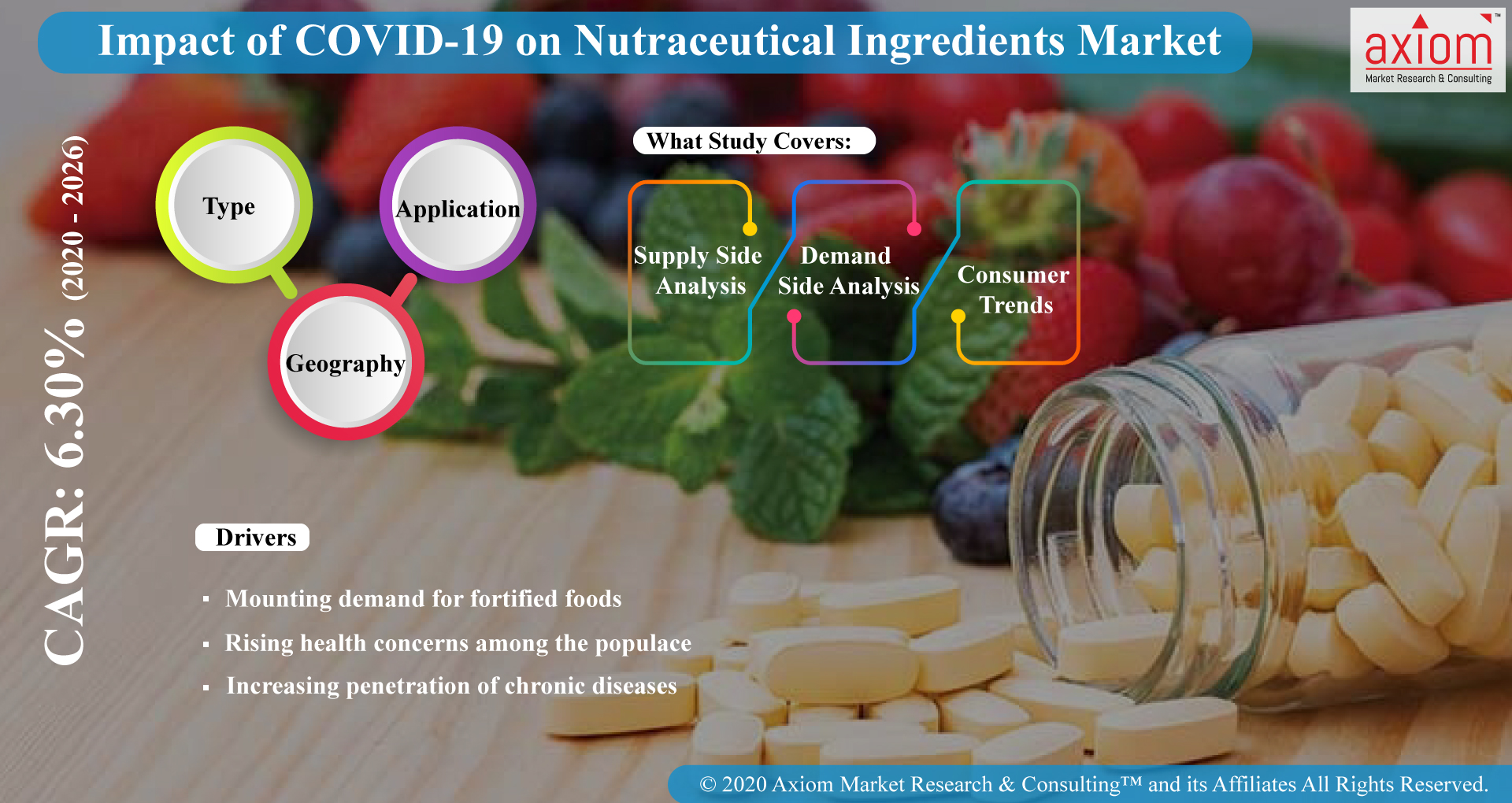 Wilmington, Delaware Jun 25, 2020 (Issuewire.com) - Axiom Market Research & Consulting™ published a report on the impact of COVID-19 on the global nutraceutical ingredients market. The study covers economic indicators analysis by major countries and impact on nutraceutical ingredients market of respective countries along with GDP, food & beverage expenditure, government policies, business investments, key marketing strategies etc. The global nutraceutical ingredients market was projected to grow at a CAGR of 4.78% over the forecast period of 2020 to 2026. The global market is estimated and forecasted in terms of revenue (USD million) ad volume (KT) generated by the Nutraceutical ingredients market.