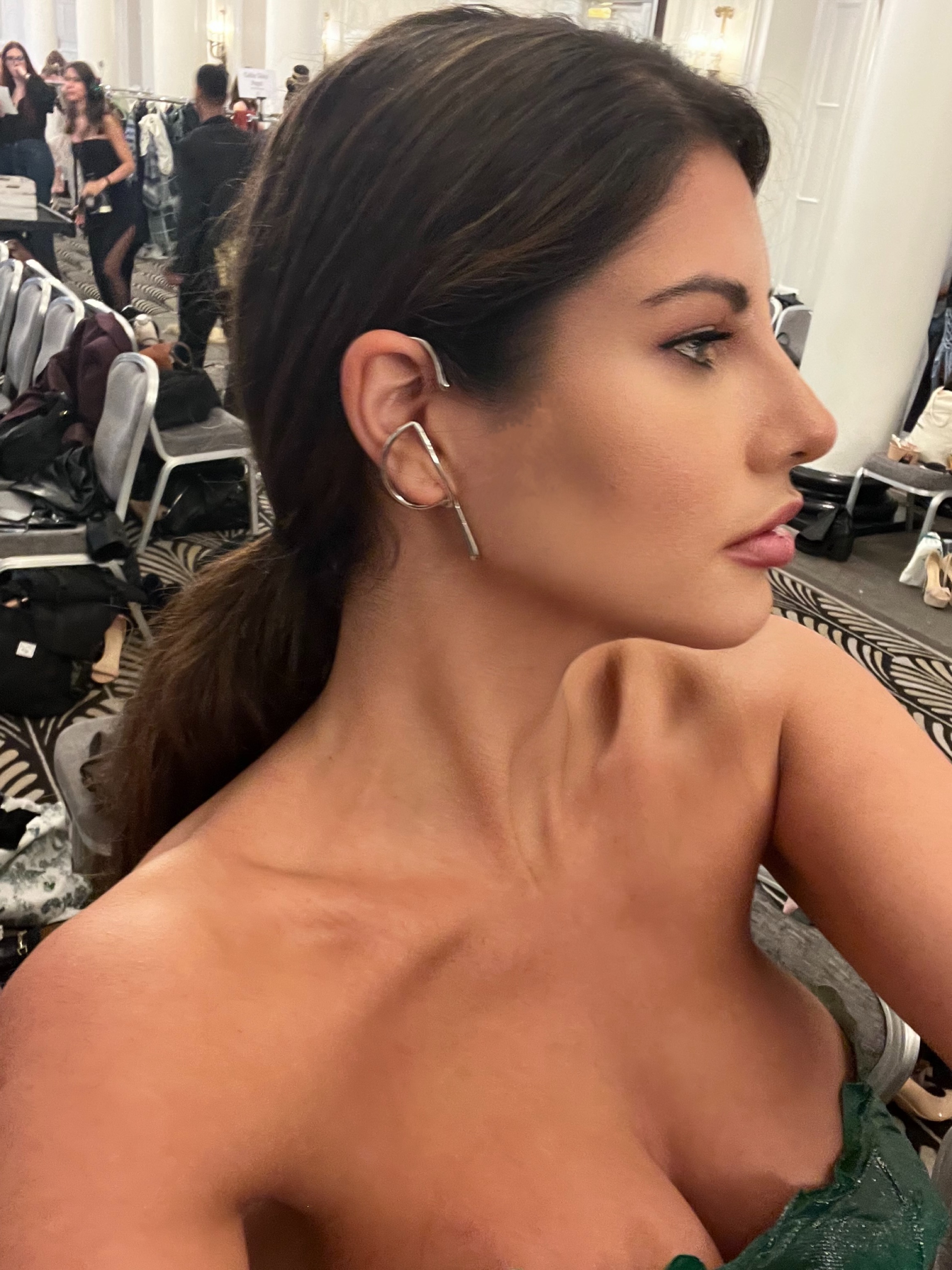 For the Fall 2025 ready-to-wear MAYKL collection, Walton modeled a backless green and silver corset that highlighted the model’s toned figure and slim but voluminous silhouette, paired with wavy green trousers with asymmetrical fabrics that the model knew how to professionally showcase on the runway.