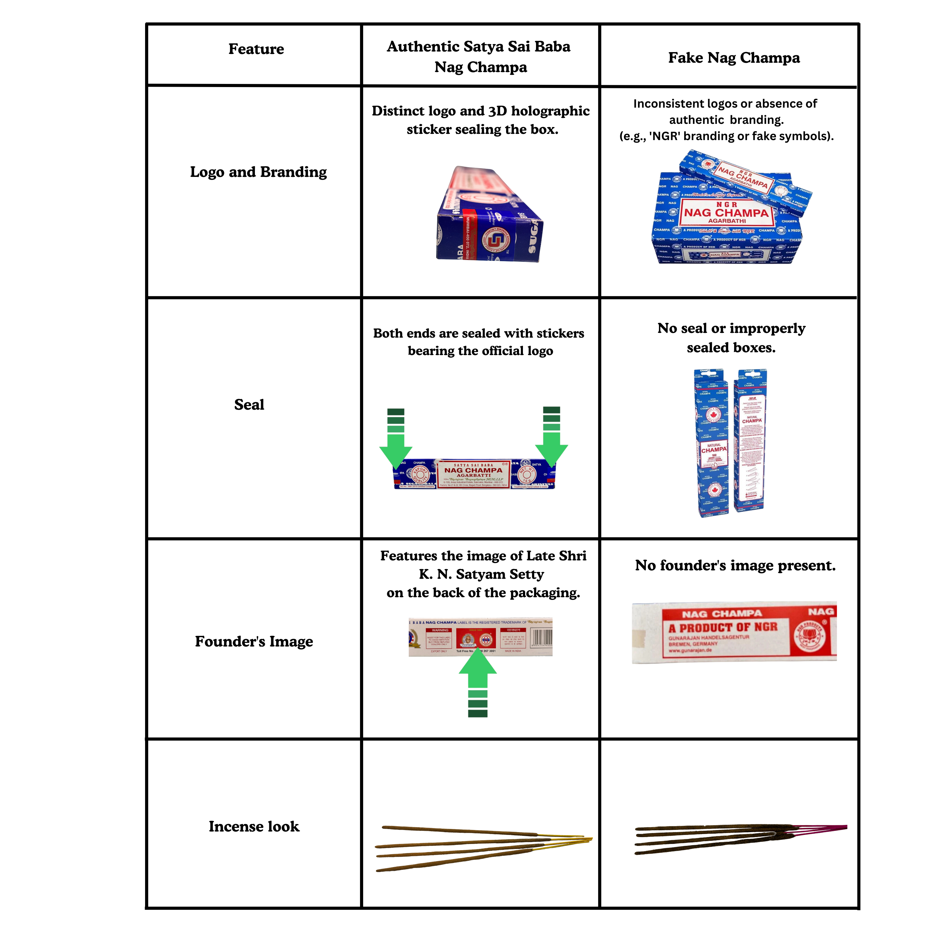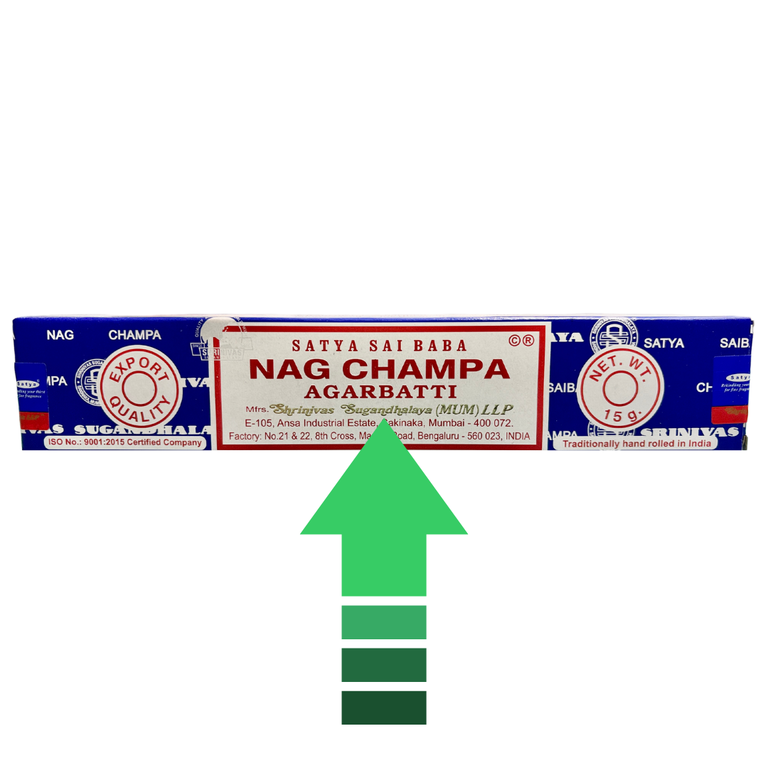 Authentic Satya Sai Baba Nag Champa product. It features earthy, natural undertones, making it ideal for meditation. In contrast, the fake version is smaller, has a smoky smell with no fragrance, or, if there is any scent, it smells like chemicals.