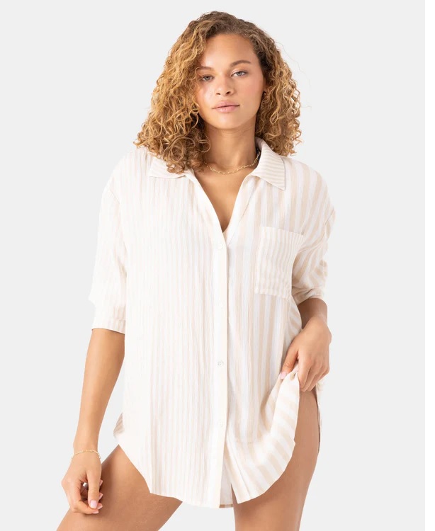 Elevate your tops game with women's shirts that mix performance and polish. Rip Curl's Dawn Patrol Long-Sleeves shield against sun with UPF 50+ rash guards, now in breathable mesh panels for 2026. Billabong's Organic Cotton Button-Ups offer oversized fits with roll-tab sleeves, ideal for layering over tanks. Roxy's Breezer Shirts bring crochet accents and relaxed collars, while O'Neill's Tech Tees wick sweat during hot yoga flows. Lspace introduces silk-blend camp shirts with subtle surf motifs, perfect for dinner dates under string lights.