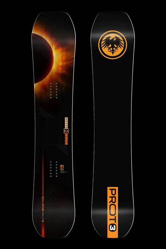 Never Summer Mens Snowboard Proto T3 Eclipse: The Never Summer Proto T3 Eclipse Snowboard is an all-mountain snowboard designed for intermediate to advanced riders. It features Recurve Traditional Camber and R.I.P. Tech for enhanced edge hold and stability across various terrains. With its PowerSurf Core and Precision Stitched Carbon Matrix, this board delivers a responsive and stable ride. It's available in various sizes, including regular, wide, and ultra-wide widths