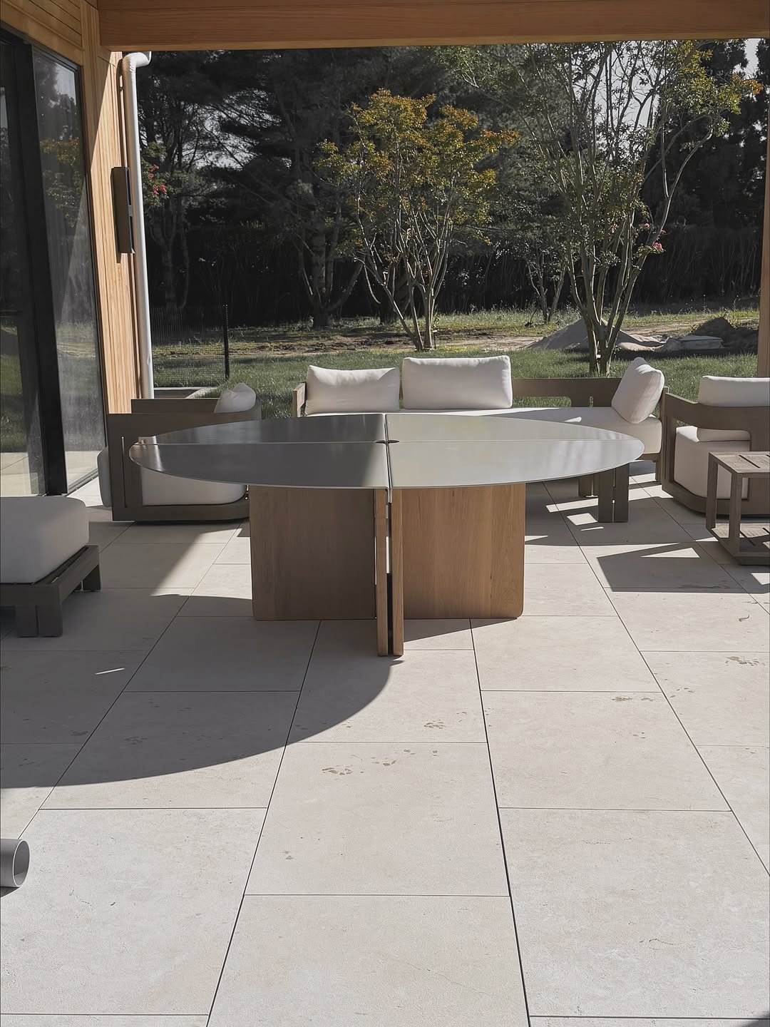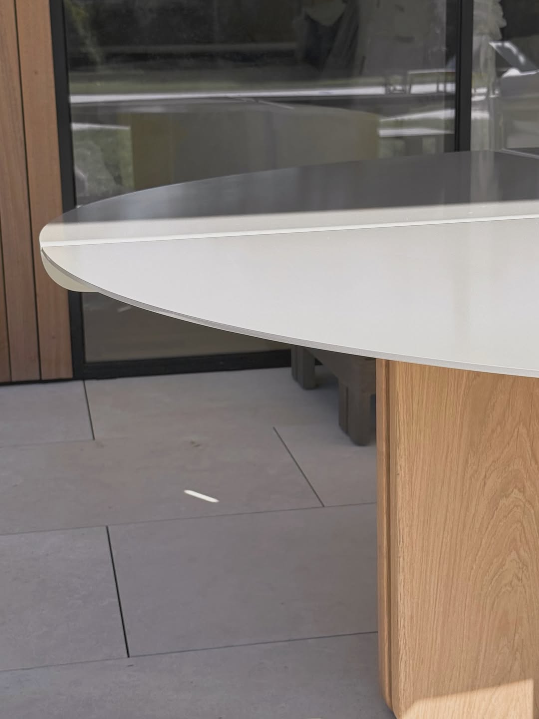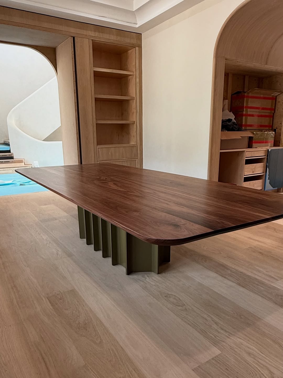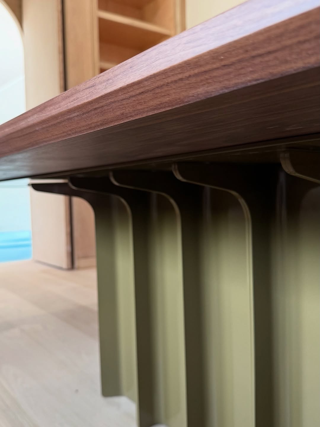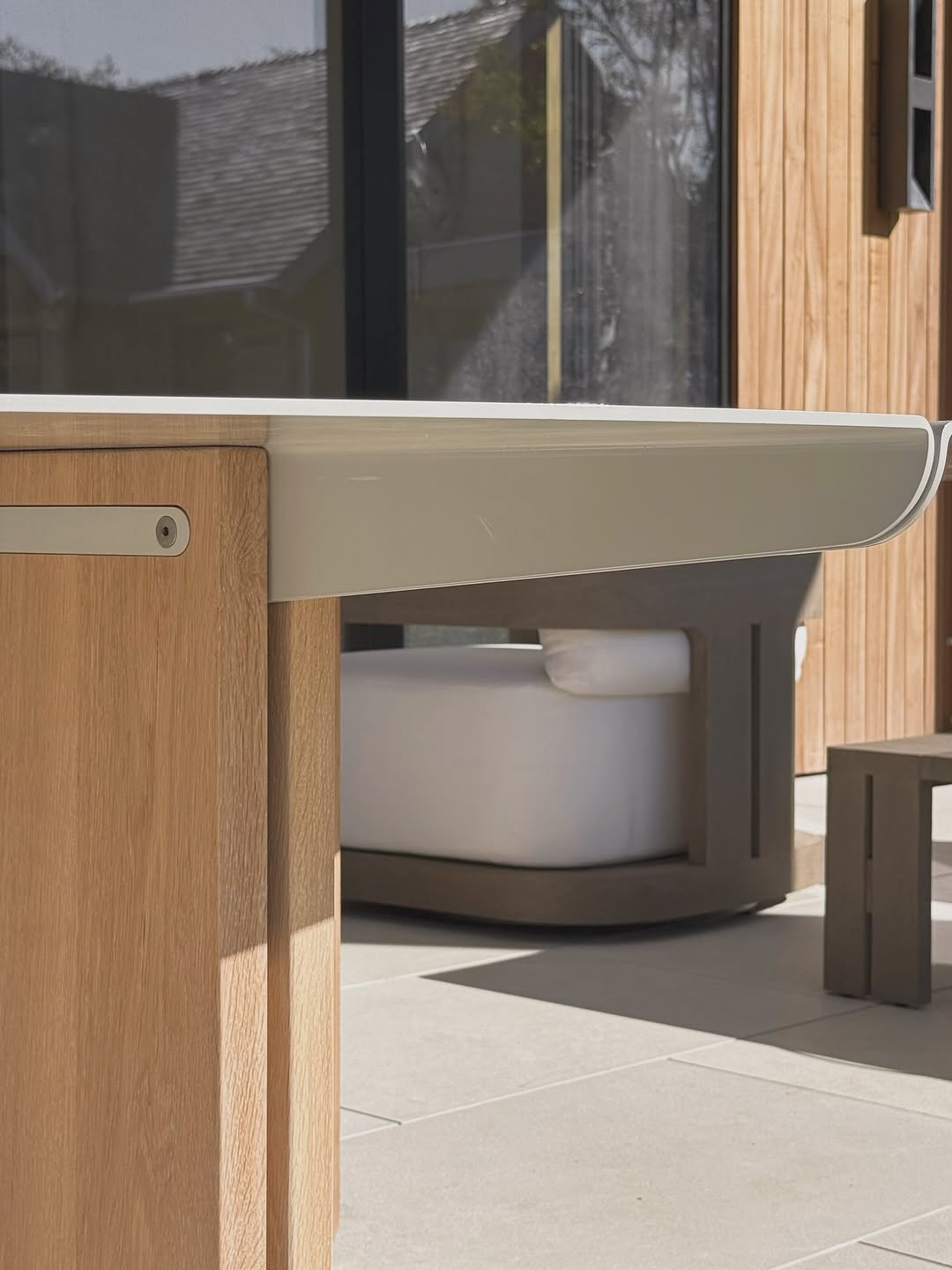 The indoor centerpiece includes a sculptural ribbed base engineered by Bestcase and a handcrafted walnut top finished with Hardtwood’s 100% VOC-free hardwax oil. The result balances modern architecture with timeless woodworking craftsmanship. Outdoors, a custom white oak base paired with a precision-fabricated metal top extends the design language seamlessly into the exterior living space.