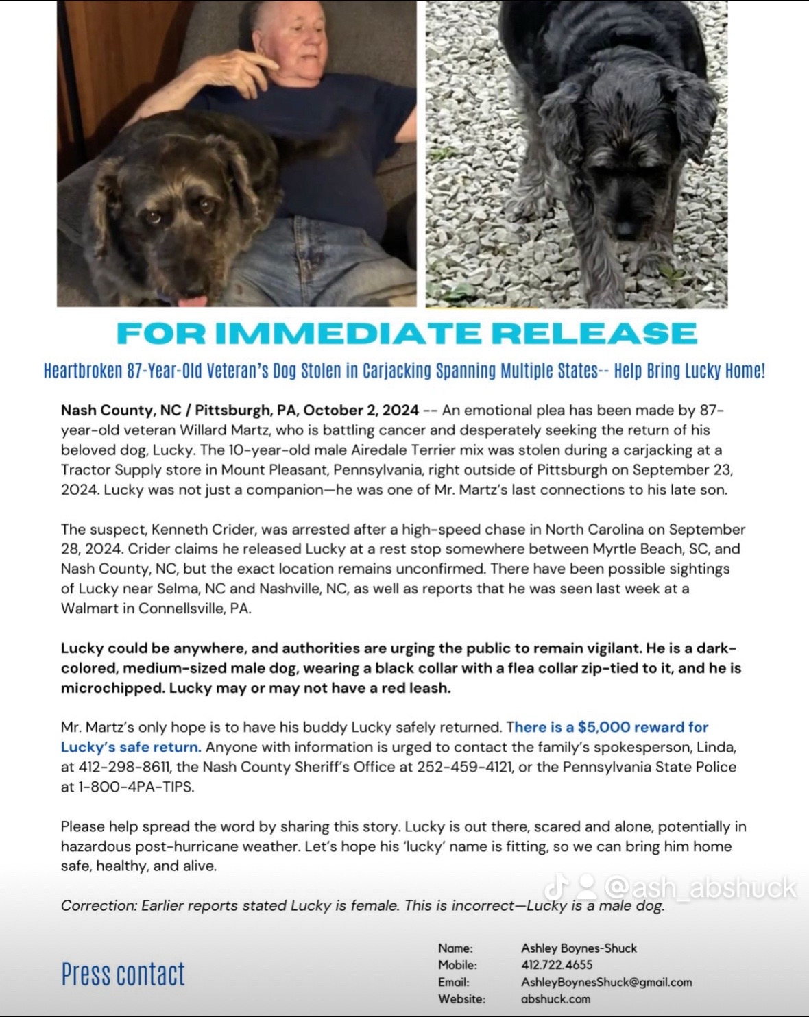 The 10-year-old male Airedale Terrier mix Lucky was stolen during a carjacking at a Tractor Supply store in Mount Pleasant, Pennsylvania, right outside of Pittsburgh on September 23, 2024– and Lucky was not just a companion—he was one of Mr. Martz’s last connections to his late son.