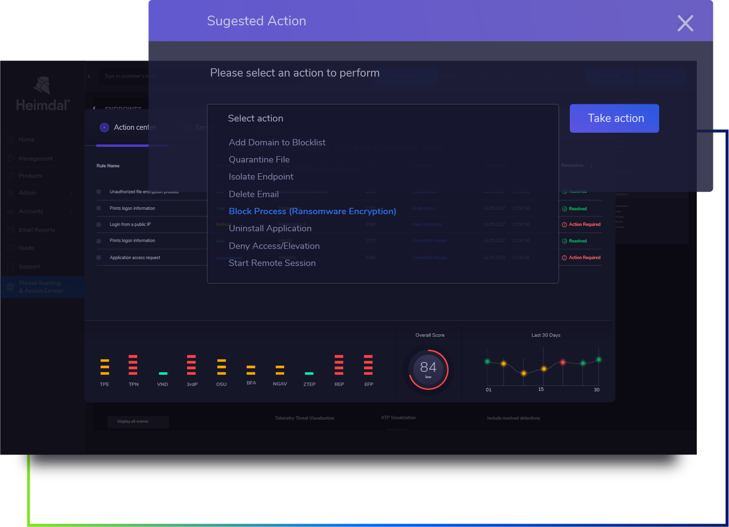 With Heimdal’s Threat-hunting and Action Center, every risk will be pre-computed, allowing the platform to generate an adequate course of action, removing the time needed to analyse the data manually and saving valuable time and resources in the process.