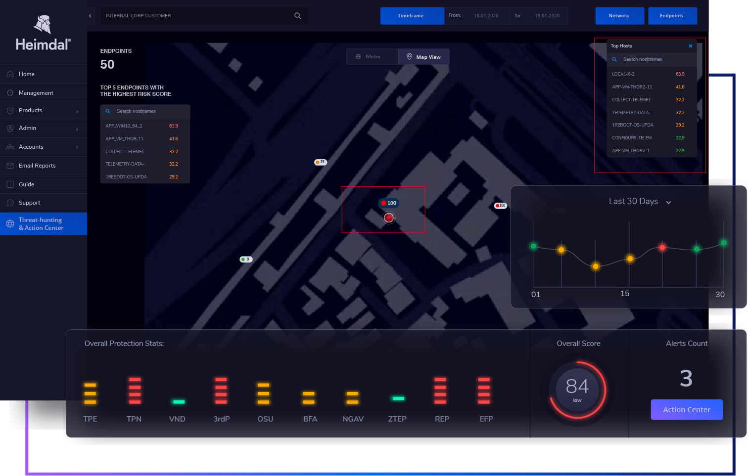The platform seamlessly collects and collates data from the far corners of the unified Heimdal environment (i.e. DNS metrics, vulnerability management stats, endpoint-level alerts, privileges modifications, access control gateways, email inbound/outbound ruling, inter-process communication, remote connections, managed endpoint and network-level monitoring) with unmatched flexibility and scalability in the market.