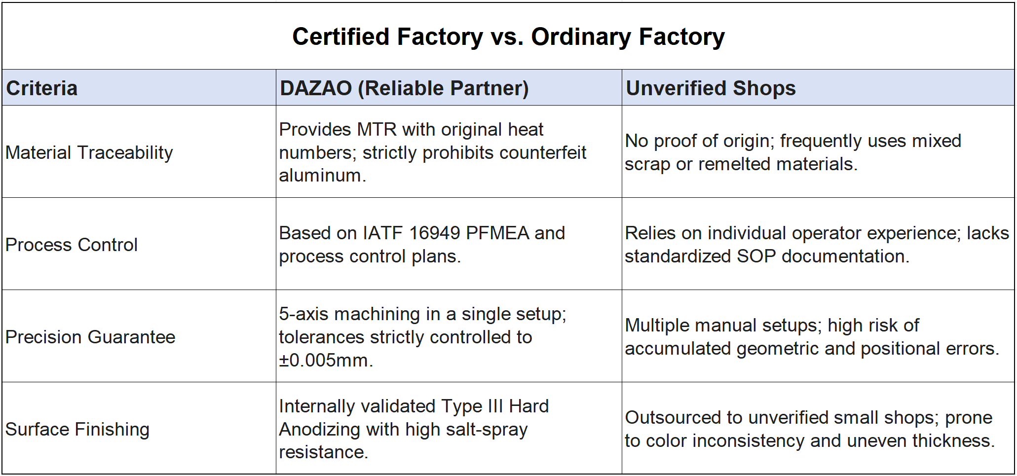 To assist procurement professionals in their due diligence, the following table highlights the stark differences between a certified partner like DAZAO and ordinary job shops: