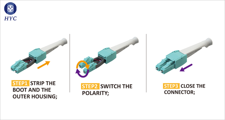 The traditional LC connector uses two jumper independent connections. If you want to change the polarity of the transmission and reception, you need to change the entire wiring system. It is difficult to do that and prone to failure. The uniboot option includes a reversing polarity feature that provides quick and easy polarity changes in the field. Polarity changes can be made in the field quickly, without the use of tools, to the correct fibre mapping polarity.