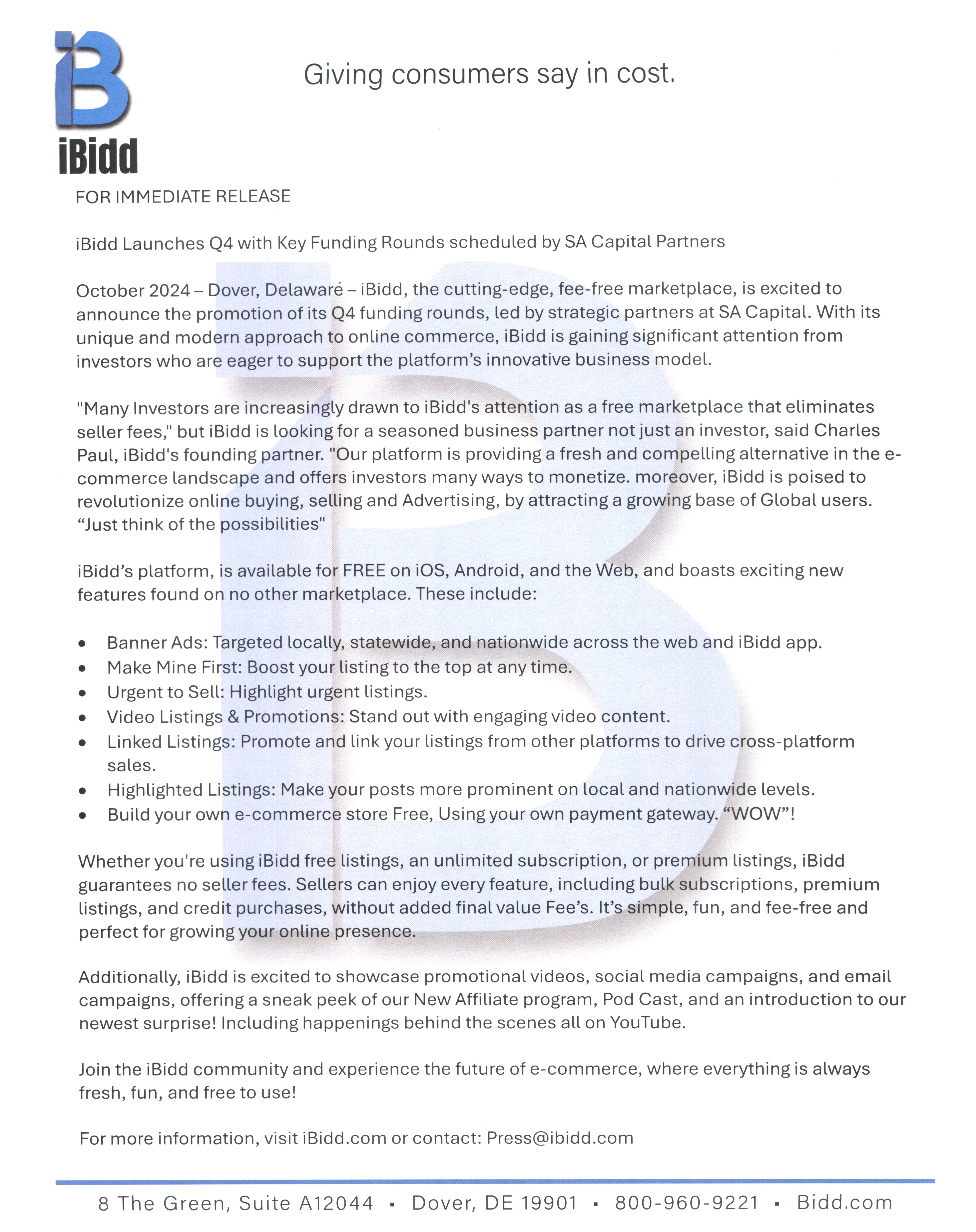 Dover, Delaware Oct 1, 2024 (Issuewire.com) - iBidd Launches Q4 with Key Funding Rounds scheduled by SA Capital Partners