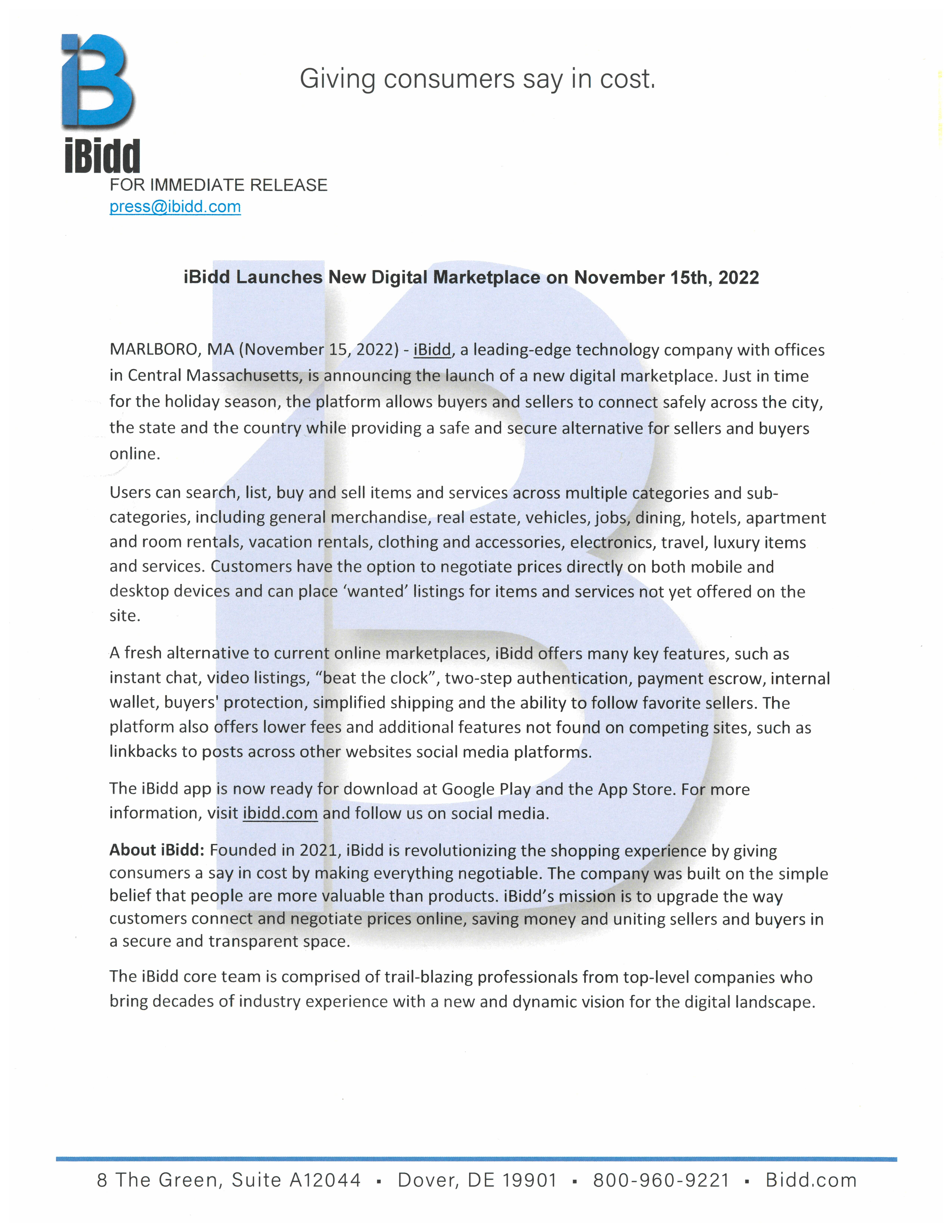 iBidd.com Press@ibidd.com 8009609221 8 The Green, Suite A, 12044 Dover, Delaware 19901 https://www.ibidd.com/