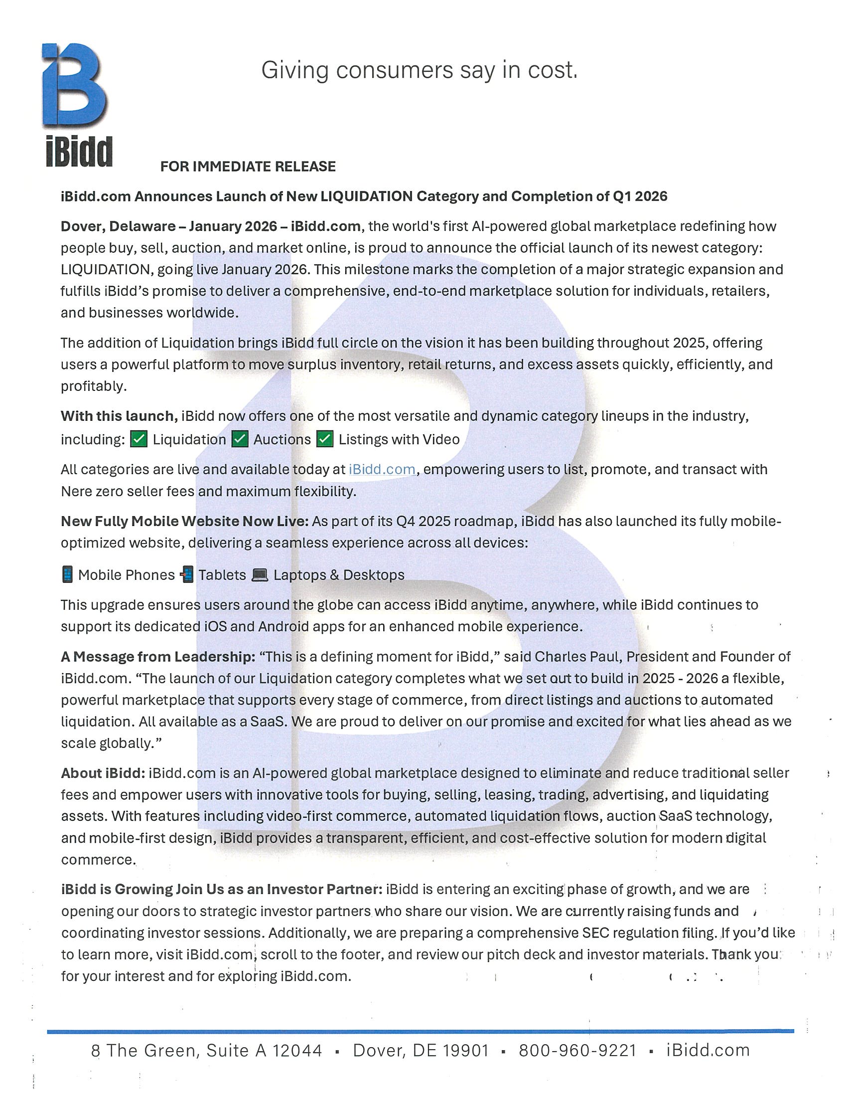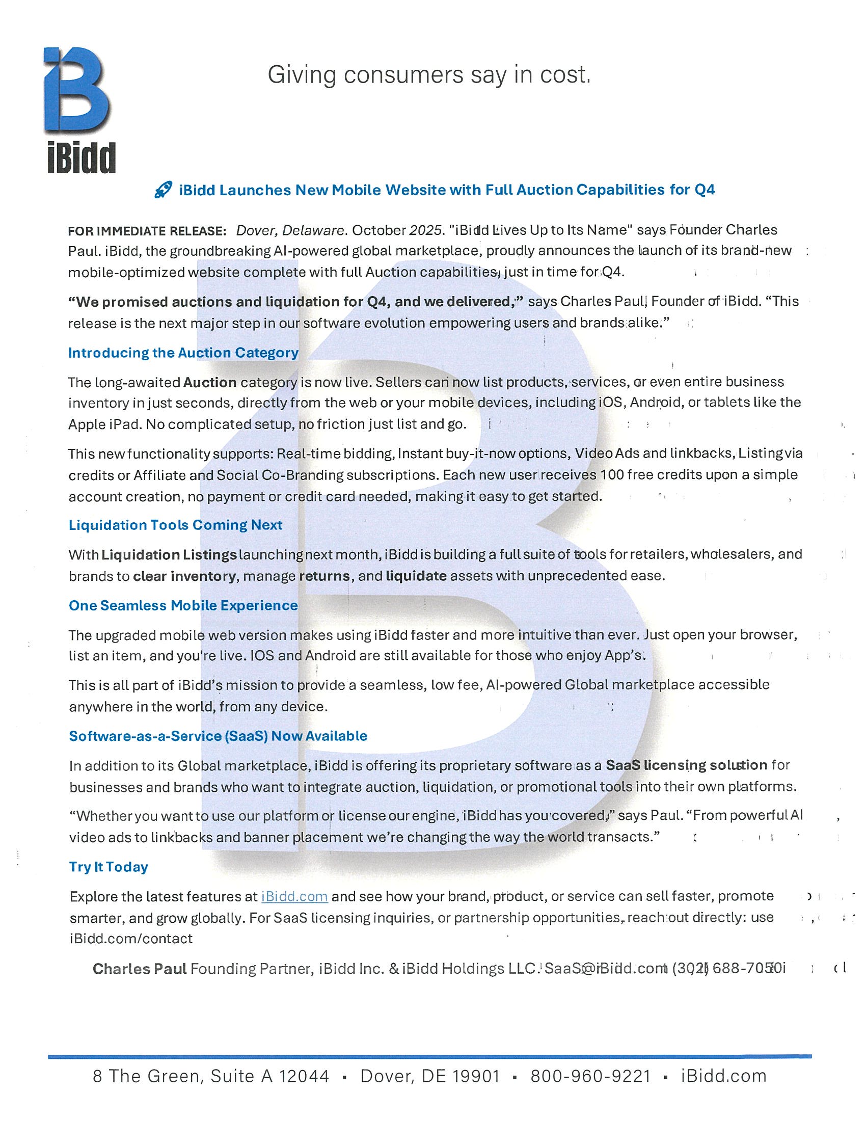 A Message from Leadership: “This is a defining moment for iBidd,” said Charles Paul, President and Founder of iBidd.com. “The launch of our Liquidation category completes what we set out to build in 2025 - 2026 a flexible, powerful marketplace that supports every stage of commerce, from direct listings and auctions to automated liquidation. All available as a SaaS. We are proud to deliver on our promise and excited for what lies ahead as we scale globally.”