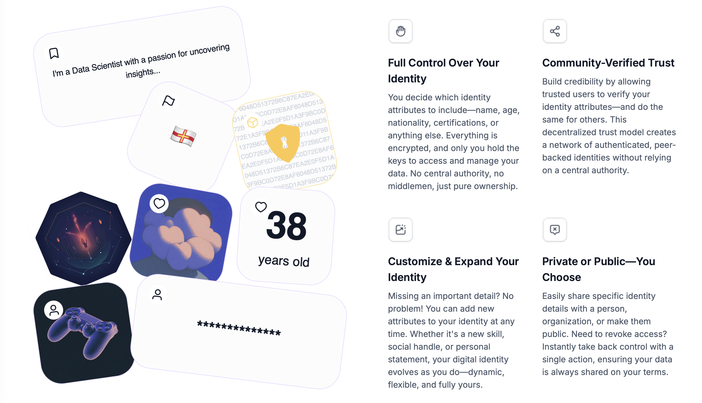 Unlike conventional identity platforms, IDNTTY’s solution doesn’t rely on a single authority to validate identities. Instead, it introduces Community-Verified Trust, where identity verification is decentralized and transparent. Users can create and customize their digital identities, choosing whether to keep their information private or make it public. The flexibility to expand and enhance identities with Verifiable Credentials means that individuals, companies, and communities can add trusted proof of skills, achievements, and memberships with ease.