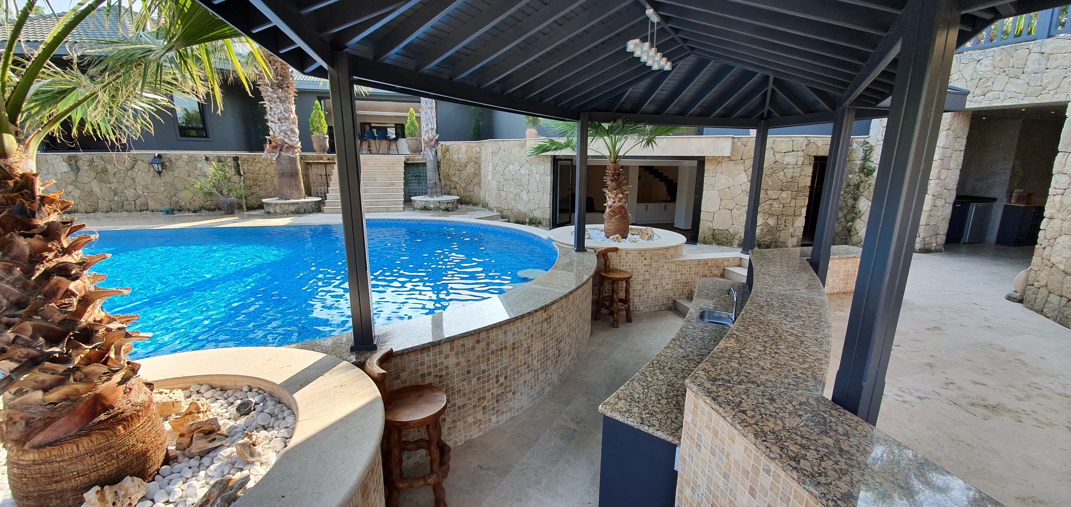 The outside features a semi-Olympic swimming pool, bar area, private jacuzzi room designed to be connected to a swimming pool and a mini swimming pool, as well as a private kitchen and dining area where one can comfortably accommodate their guests. Also on the property is a private garage.