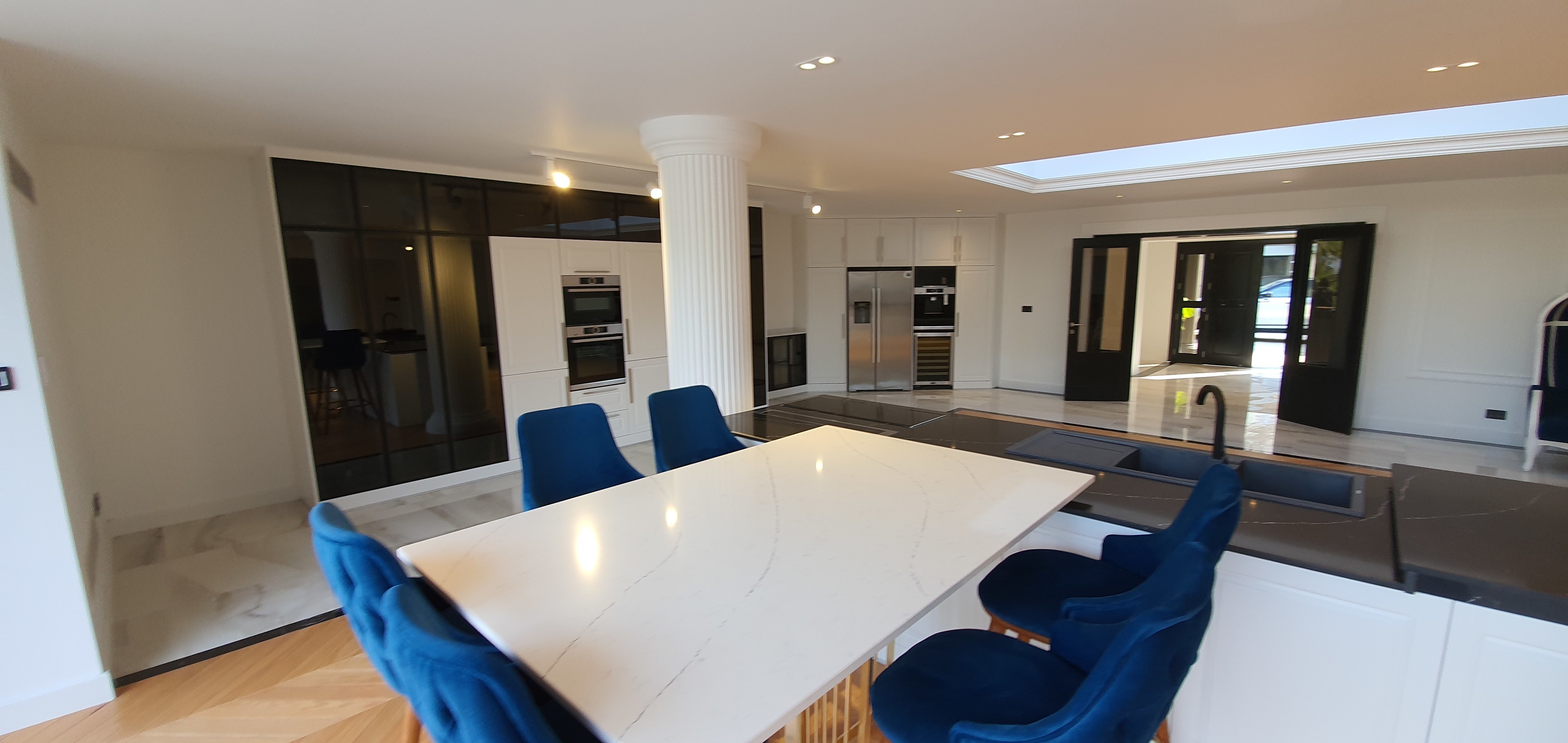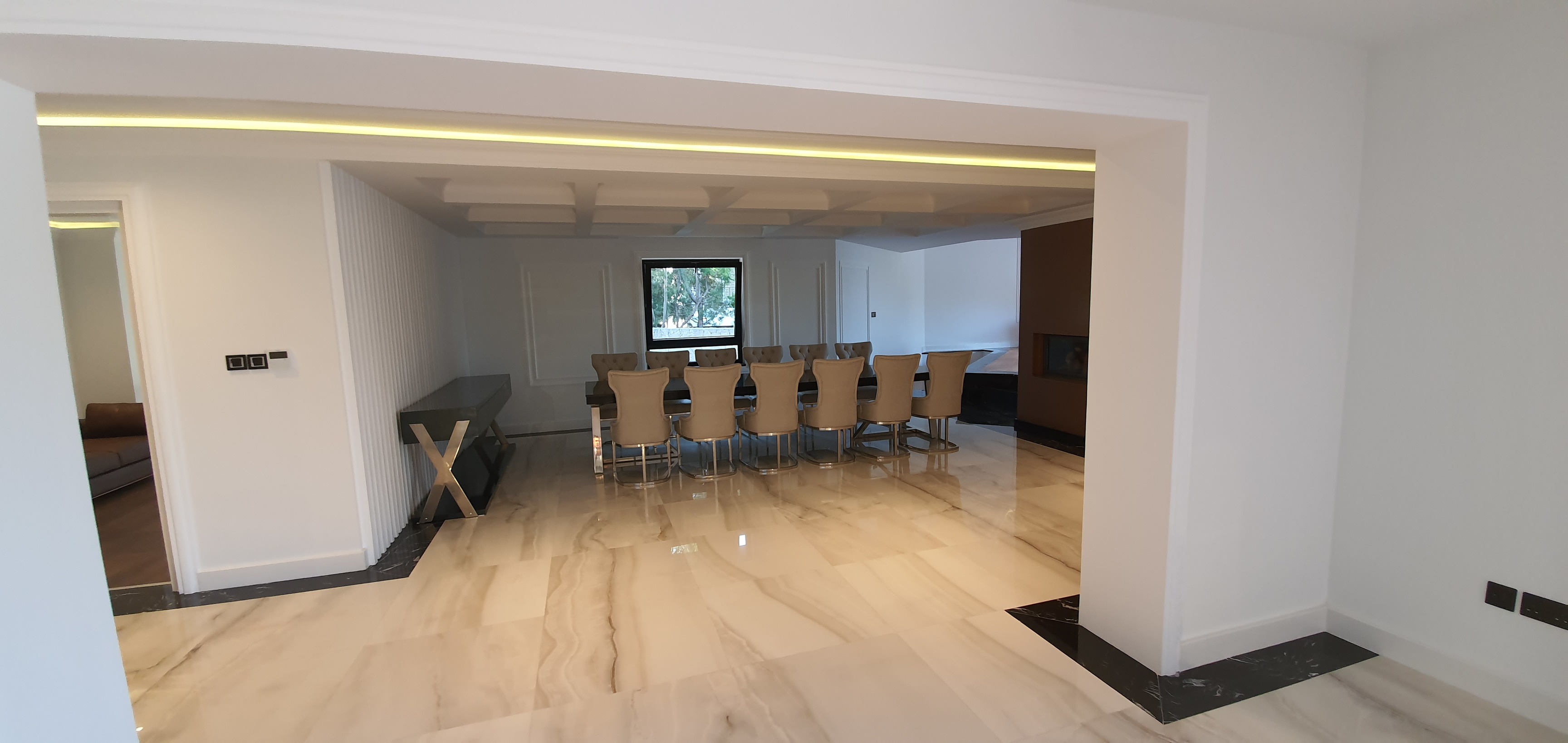 The main villa has three bedrooms and four bathrooms. It was designed to incorporate comfort, luxury, simplicity and grandeur, which can be seen throughout the residences’ study room, fitness room, sauna, relaxation room, and cinema room. The villa features an elegantly designed and spacious master bedroom, with an eye-catching dressing room and bathroom. There are also 3 halls and 2 kitchens in this luxury residence.