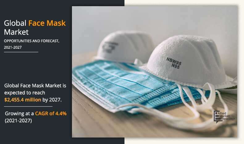Pune, Maharashtra May 22, 2020 (Issuewire.com) - "Face Mask Market by Type, Material, Nature, and Distribution Channel: Opportunity Analysis and Industry Forecast, 2021–2027," The global face mask market size was valued at $1,523.0 million in 2019, and is estimated to reach $ 2,455.4 million by 2027 with a CAGR of 4.4% from 2021 to 2027. Increase in consumer awareness regarding airborne health infections such as COVID19, influenza, chickenpox, mumps, measles, tuberculosis (TB), diphtheria, and others creates the demand for the face mask products. In addition, an increase in government initiatives along with various communities and NGOs to make people aware of the airborne diseases through online and offline advertisements augment the growth of face mask market.