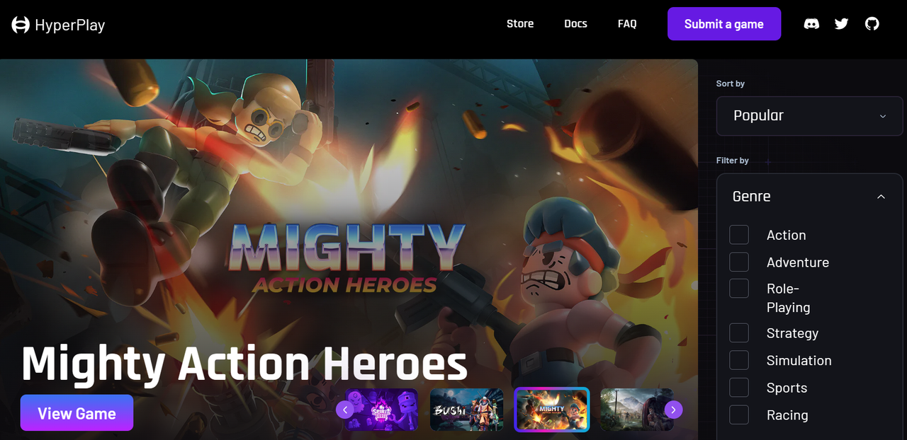Upon entering the HyperPlay official website, users can click on the "Store" button at the top to access the Web3 game marketplace. Through detailed categorization, users can search and select specific Web3 game projects, entering the game's details page and embarking on the Play-to-Earn journey.
