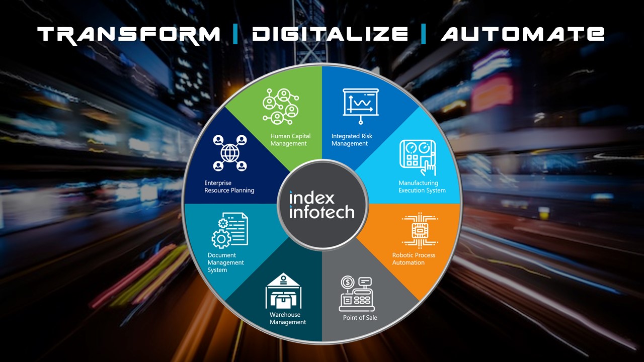 Index InfoTech offers solutions and services for ERP, HCM, ECM, IRM, GRC, MES, BI & Analytics, Robotic Process Automation (RPA), Voice based technology and Smart Automation. Index InfoTech has served more than 100 customers globally and looks forward to assisting more businesses in their digital transformation journey.