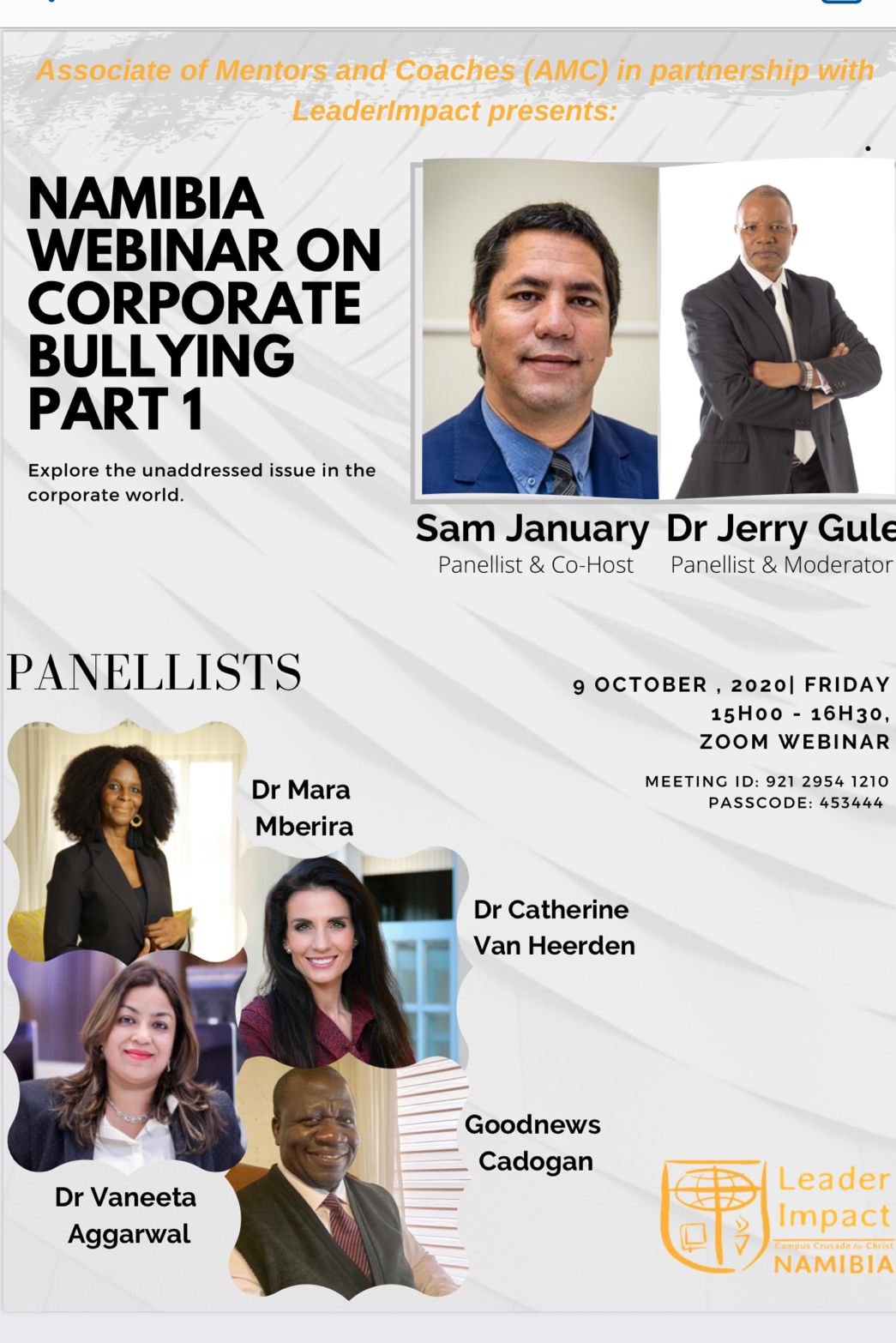 Delhi, India Oct 9, 2020 (Issuewire.com) - The Founder CEO of L'strategyQ Advisors, Dr Vaneeta Aggarwal is invited as an international panelist on the Namibian chapter hosting part 1 of webinar series addressing the issue of Corporate Bullying. She strongly advocates anti-bullying policy at workplaces to promote mental health of employees and staff.