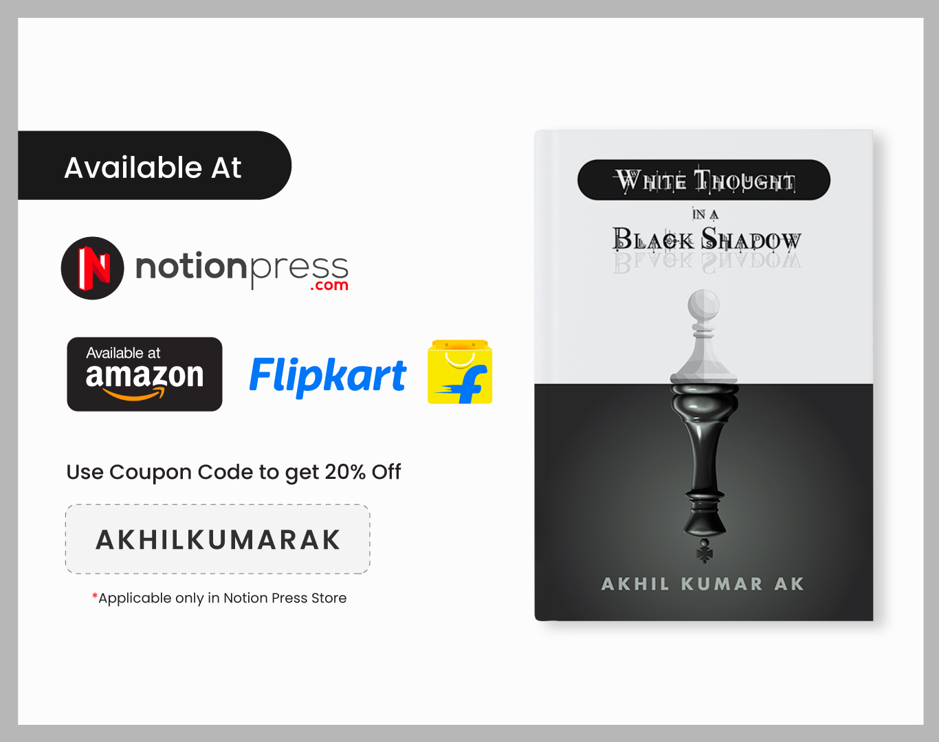 Use this coupon code “AKHILKUMARAK” to get 20% off. This coupon is applicable only in Notion Press Store.