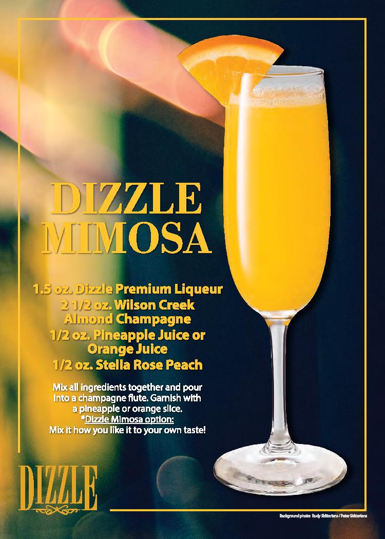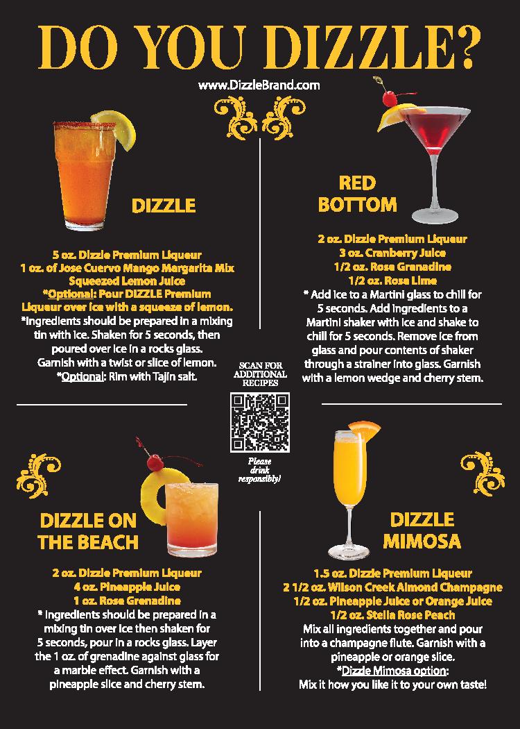 In addition to all the above, Dizzle Brand provides a variety of recipes which allows you to create your own signature Dizzle cocktails in your own home, or your local Restaurants, Bars, and Lounges, here are a few of our signature drinks below; "DIZZLE ON ICE", "DIZZLE RED BOTTOM", "DIZZLE SANGRIA", "DIZZLE ON THE BEACH", "DIZZLE MANGO TANGO", "DIZZLE OCEANA BLUE", "DAM"-(DIZZLE APPLE MARTINI), "DIZZLE MIMOSA", "DIZZLE LOCO", "DIZZLE STRAWBERRY SKIES", and "DIZZLE SOUR POWER". DO YOU DIZZLE???
