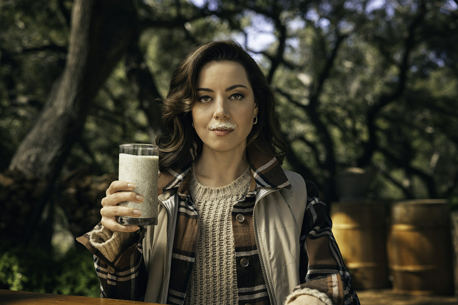"Here at Wood Milk Orchards, we're certain that our artisanal Wood Milk will be the only milk you'll want to drink for the rest of your life," says Wood Milk founder and actress Aubrey Plaza. "Why? Because I said so."