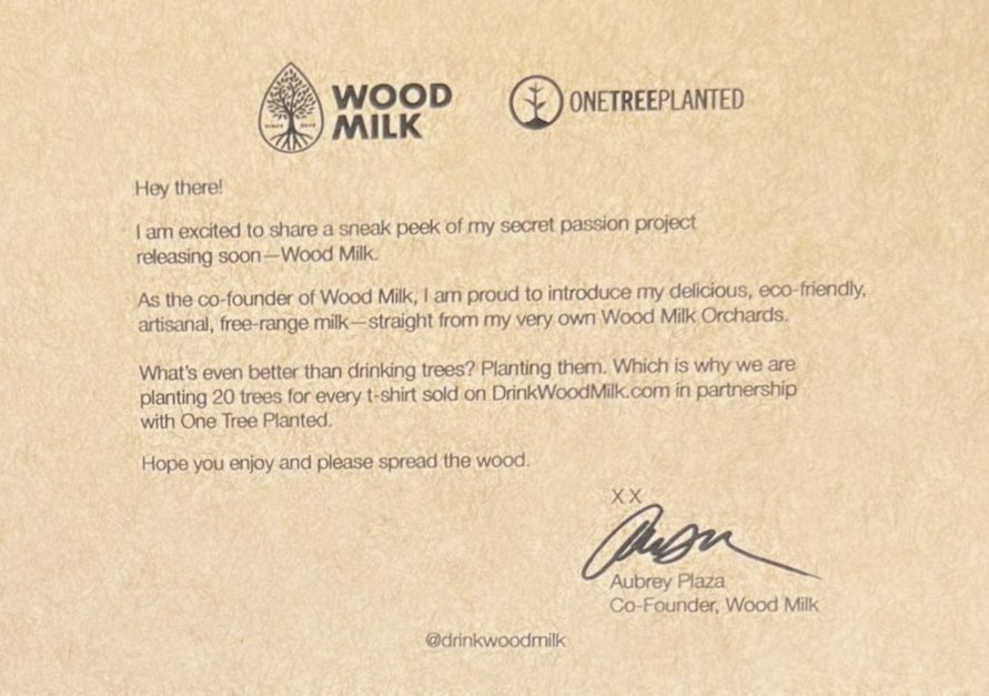 A message from our co-founder of Wood Milk Aubrey Plaza. We’re about to disrupt the milk industry like never before. #drinkwoodmilk at: