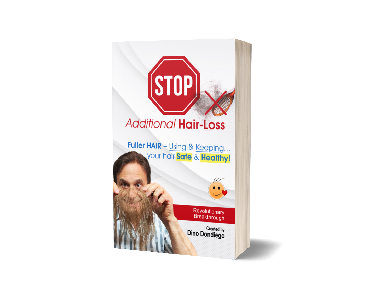 Dino Dondiego: I want to clarify that I haven’t discovered a way to stop hair loss. That’s not the subject of my book. “Stop Additional Hair Loss” is about reversing extra hair loss caused by all the procedures and techniques people use to stop losing their hair. Those methods help but at the same time speed up hair fall. Put simply, I’m creating a movement to stop “extra” hair fall caused by hair restoration and counseling processes.