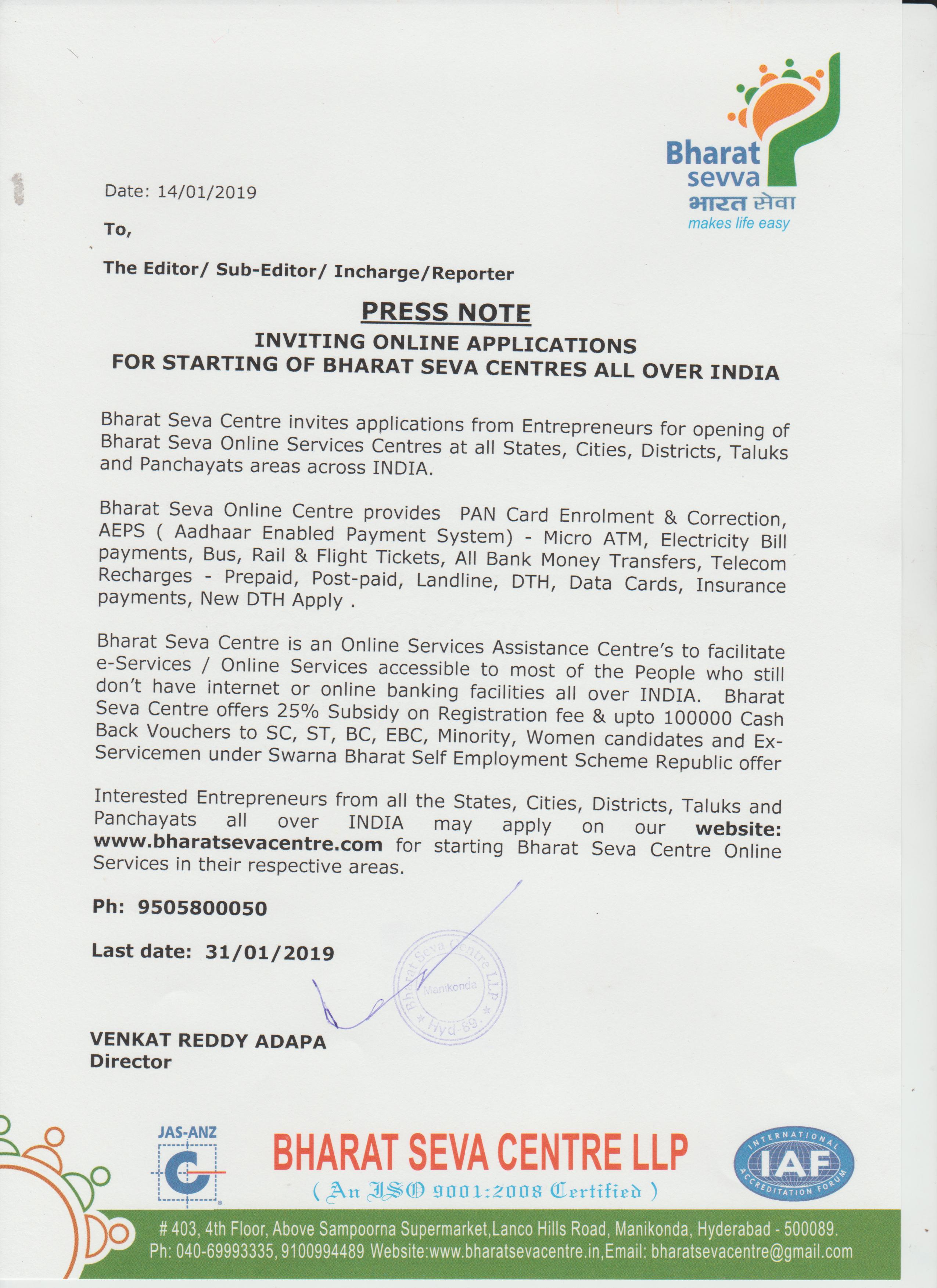Hyderabad, Telangana Jan 14, 2019 (Issuewire.com) - INVITING ONLINE APPLICATIONS FOR STARTING OF BHARAT SEVA CENTRES ALL OVER INDIA