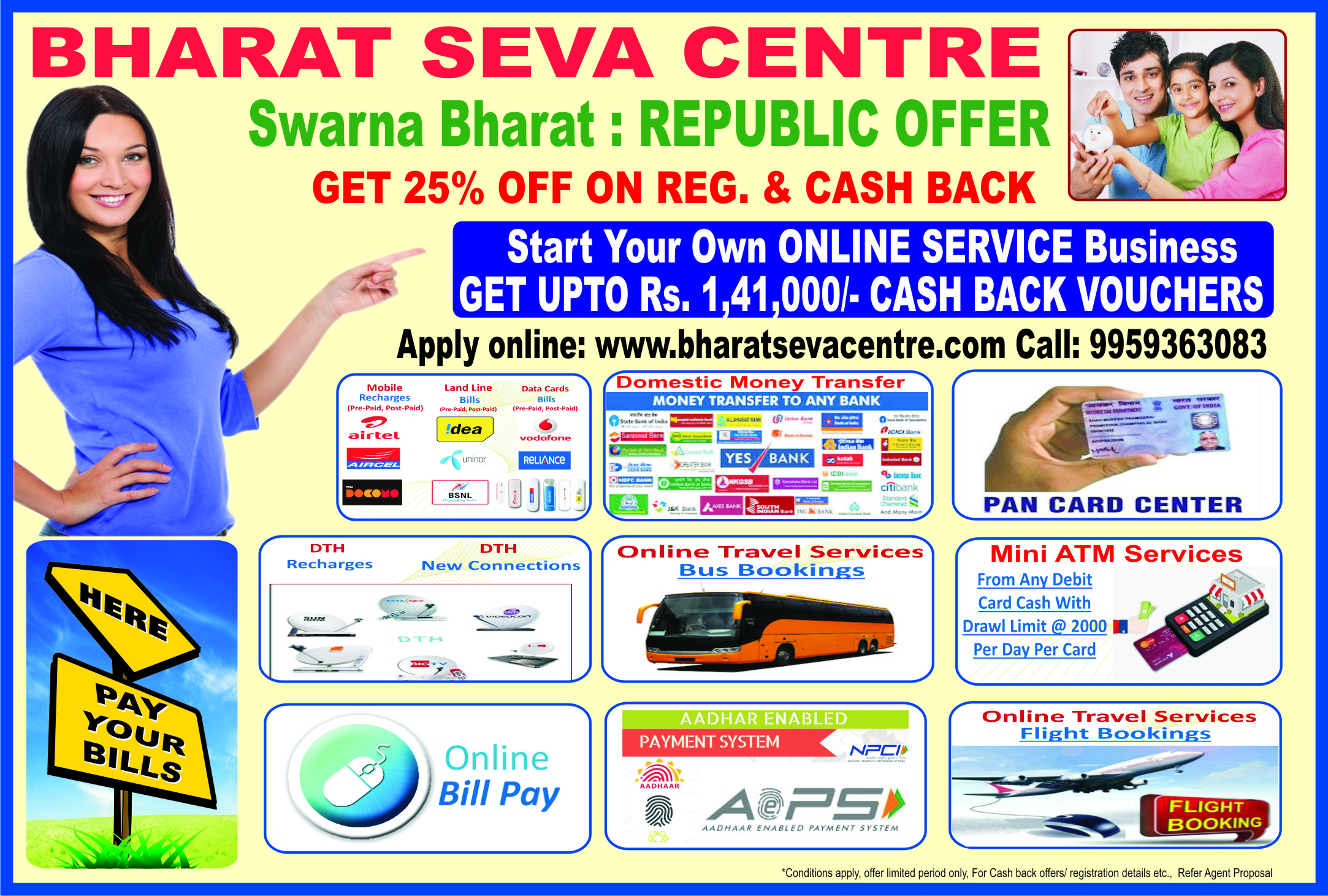 Bharat Seva Online Centre provides PAN Card Enrolment & Correction, AEPS ( Aadhaar Enabled Payment System) - Micro ATM, Electricity Bill payments, Bus, Rail & Flight Tickets, All Bank Money Transfers, Telecom Recharges - Prepaid, Post-paid, Landline, DTH, Data Cards, Insurance payments, New DTH Apply.