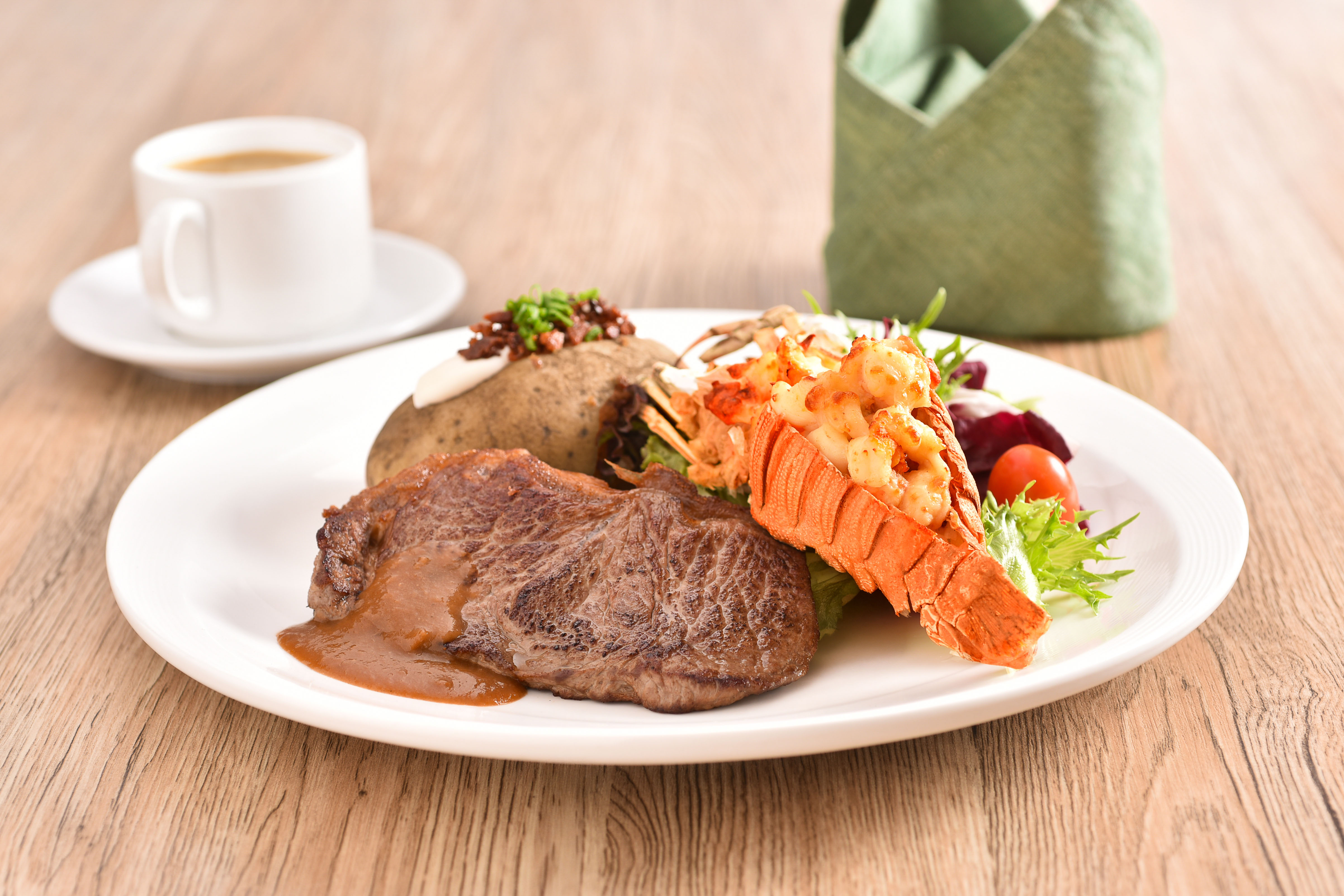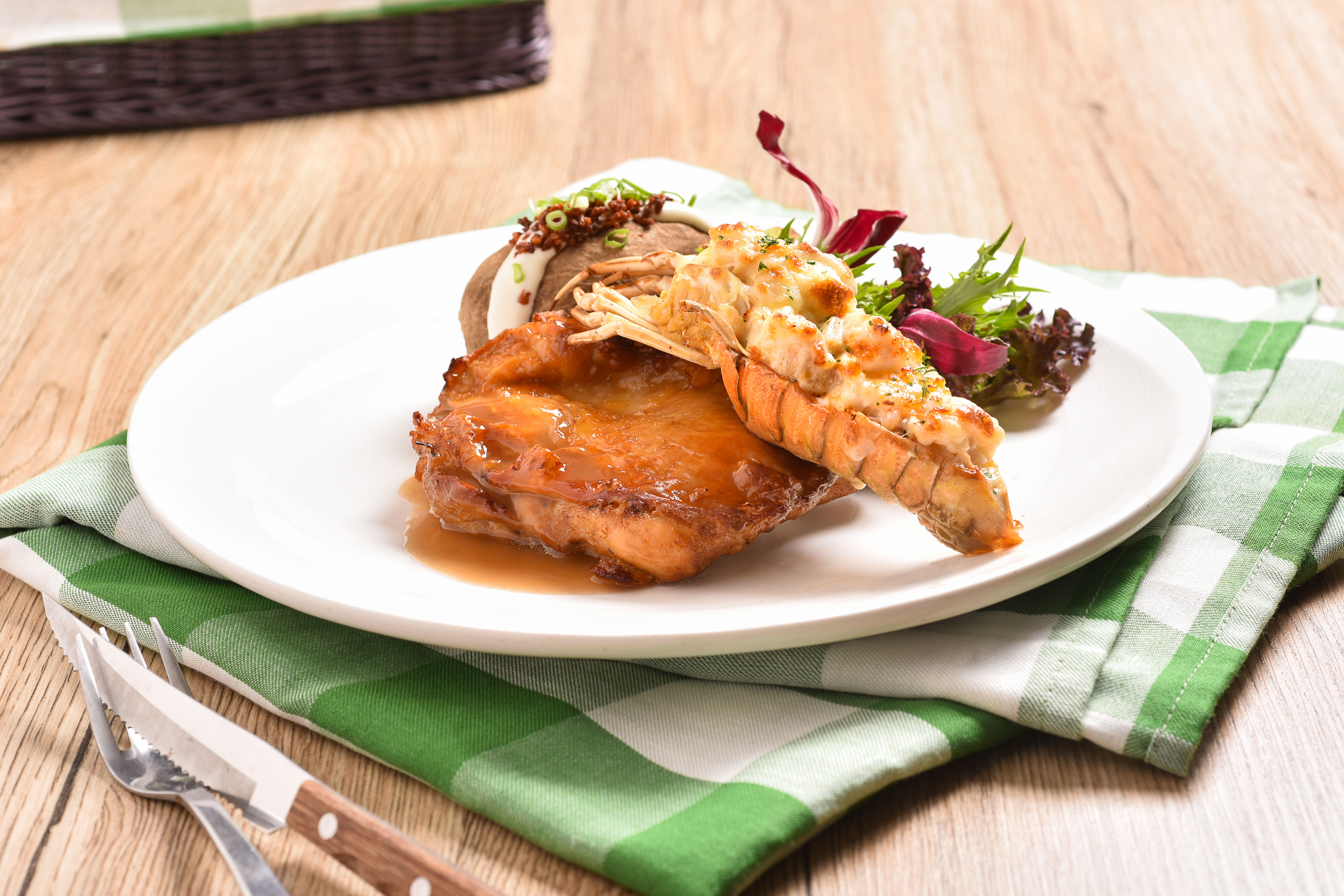 The promotion menu celebrates classic heritage with a Surf & Turf Classics selection. Featured dishes include N.Z. Tenderloin Steak with Seafood à la King, Lobster Thermidor baked in-shell with creamy mushroom and cheese, and Seafood Au Gratin with Mac & Cheese. Additionally, Slipper Lobster Thermidor is paired with either Striploin or Chicken Steak, served with the signature baked potato and seasonal vegetables.