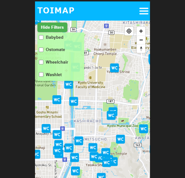 TOIMAP, a free web-based toilet search platform developed by Kyoto-based startup KICKs Inc., is now available in Kyoto, Osaka, and Kanazawa. The service allows users to easily locate public restrooms based on their current location or preferred area.