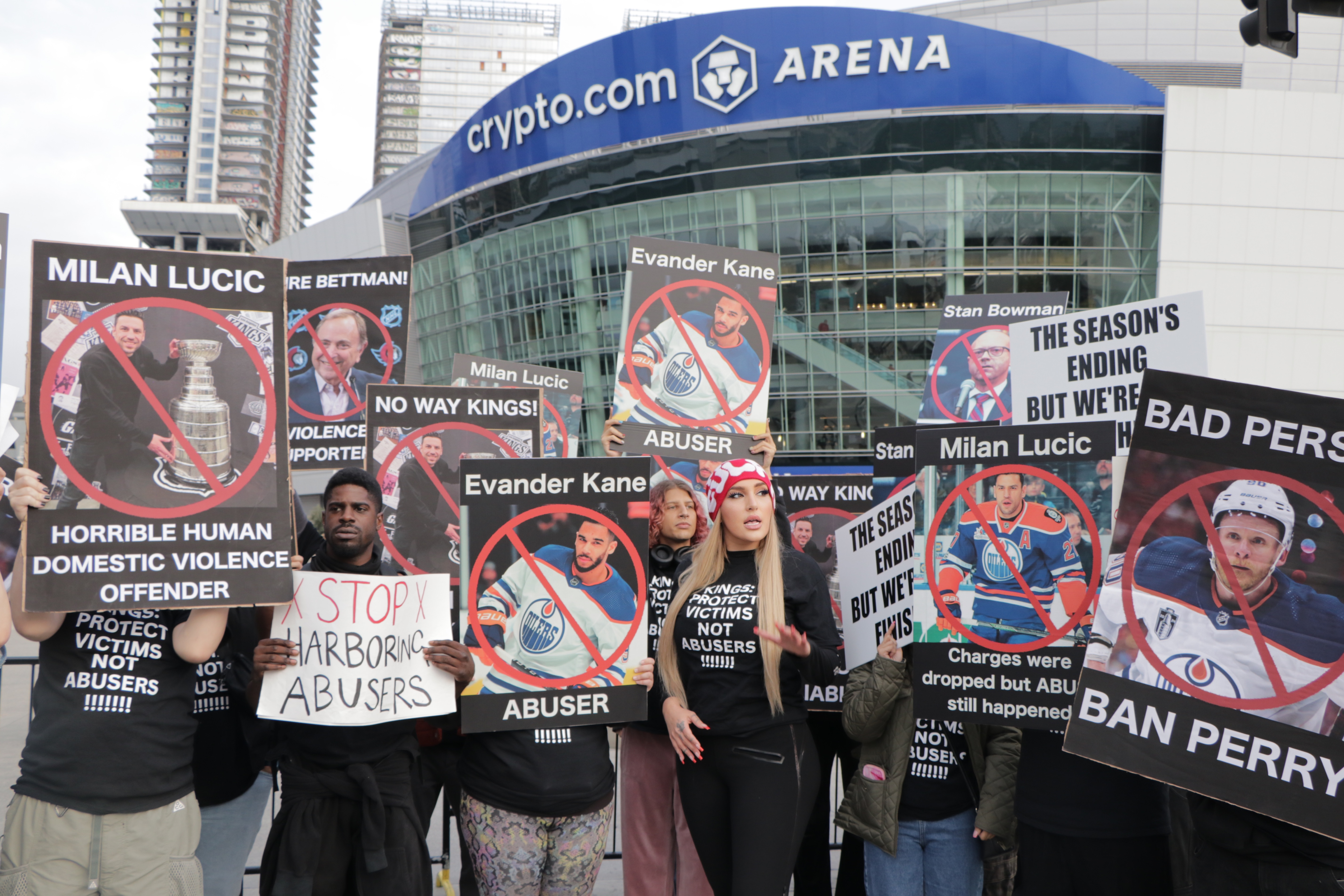 Her campaign, No Glory for Abusers, challenges the NHL’s refusal to adopt a formal domestic violence policy — a standard already in place in the NFL, NBA, and MLB. Since the start of the 2024–2025 season, Jeane Marie and her team have protested in front of every LA Kings home game, refusing to let silence become complicity.