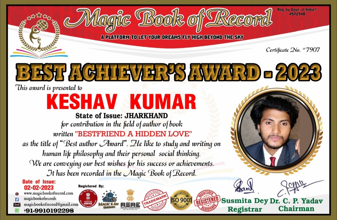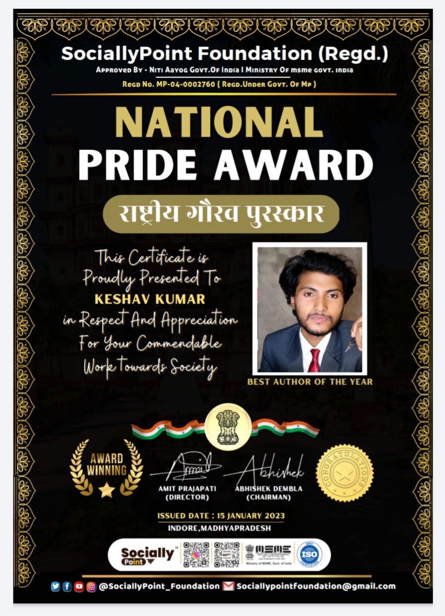 Rajmahal, Jharkhand Feb 17, 2023 (Issuewire.com) - Keshav Kumar he is the Youngest Author of the Jharkhand. Who wrote a Book at the age of 22 only. He has been honored with National Pride Award with the title of Best Author of the year for his Book. which is Based on a true story that Book name is Bestfriend a hidden love. The national award has been honoured by the government of India certified institutions that name is the socially-point foundation which is located in Madhya Pradesh, Indore.
