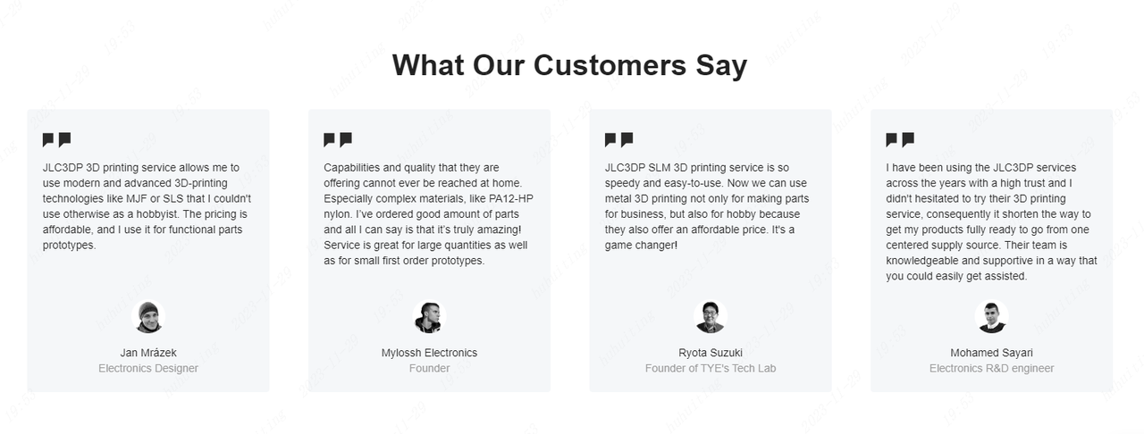 It's worth noting that JLC maintains the service model and strict quality standards in 3D printing and CNC machining similar to PCB/PCBA. This means that the high-quality service refined through the experience of millions of JLCPCB users seamlessly integrates into JLC3DP, laying a solid foundation for delivering excellent experiences to millions of JLC3DP customers.