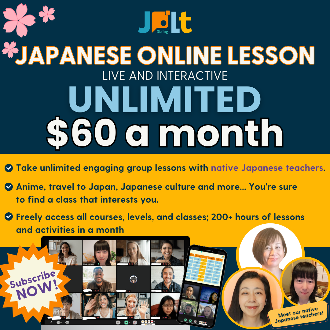 To address this, JPLT has developed a [Monthly Subscription Group Lesson Plan] to provide affordable access to quality Japanese instruction with native teachers.