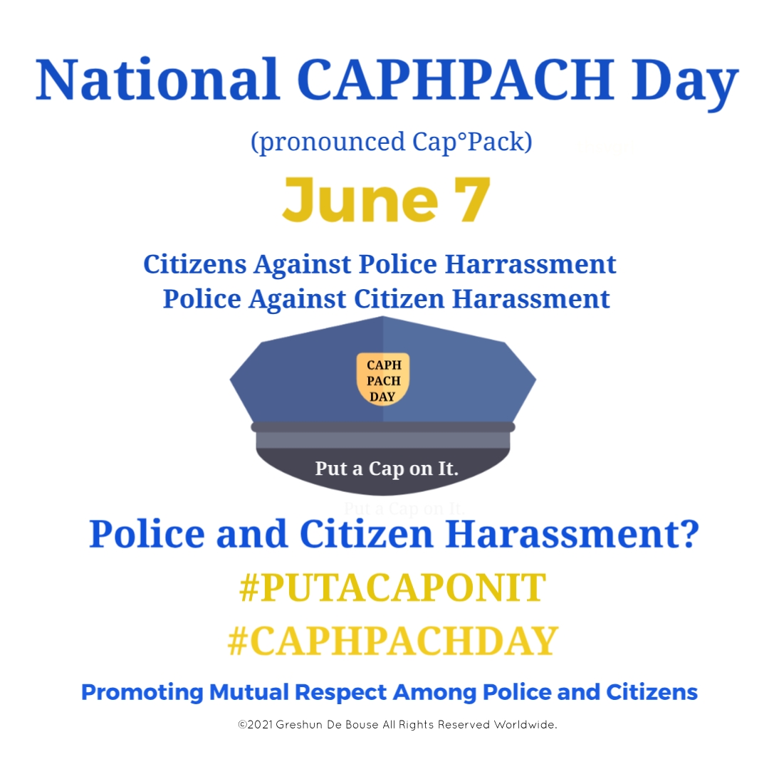 Well, now there's a hopeful holiday for this! Celebrating annually June 7, National CAPHPACH Day or #CAPHPACH Day (pronounced cap°pack) is a day of solidarity "promoting mutual respect between police and citizens" and raising awareness of the need for eradication of both police-citizen harassment and citizen-police harassment where it exists. CAPHPACH is an acronym for Citizens Against Police Harassment Police Against Citizen Harassment, and the holiday seeks to create positive dialogue between law enforcement and citizens to identify, address, and resolve issues affecting communities. The date of National CAPHPACH Day, June 7 or 6.7, is also significant. National CAPHPACH Day Founder, Respected Global Leader, and Equality Advocate Greshun De Bouse explain why.