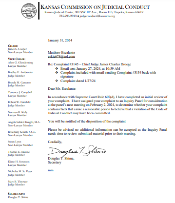 This is the Ethics Docket #3130 is seen in the photos, being heard amongst other complaint numbers by the Kansas Commission of Judicial Conduct, of alleged actions that also landed Burmaster behind a protection order case 24-CV00369.