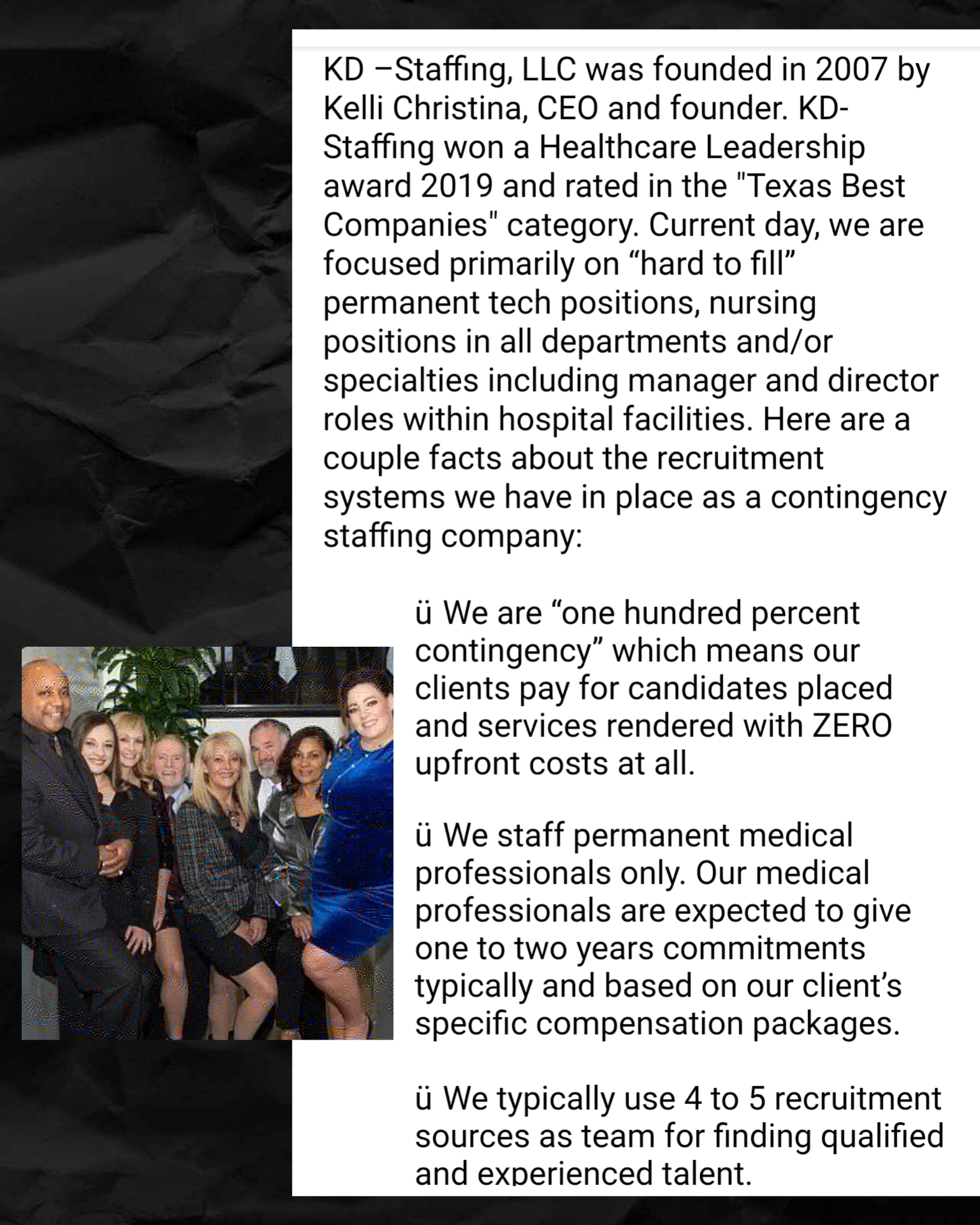 KD-Staffing, LLC kelli.kdstaffing@gmail.com 12145649217 6400 Windcrest Drive #522 https://kdstaffing.org/