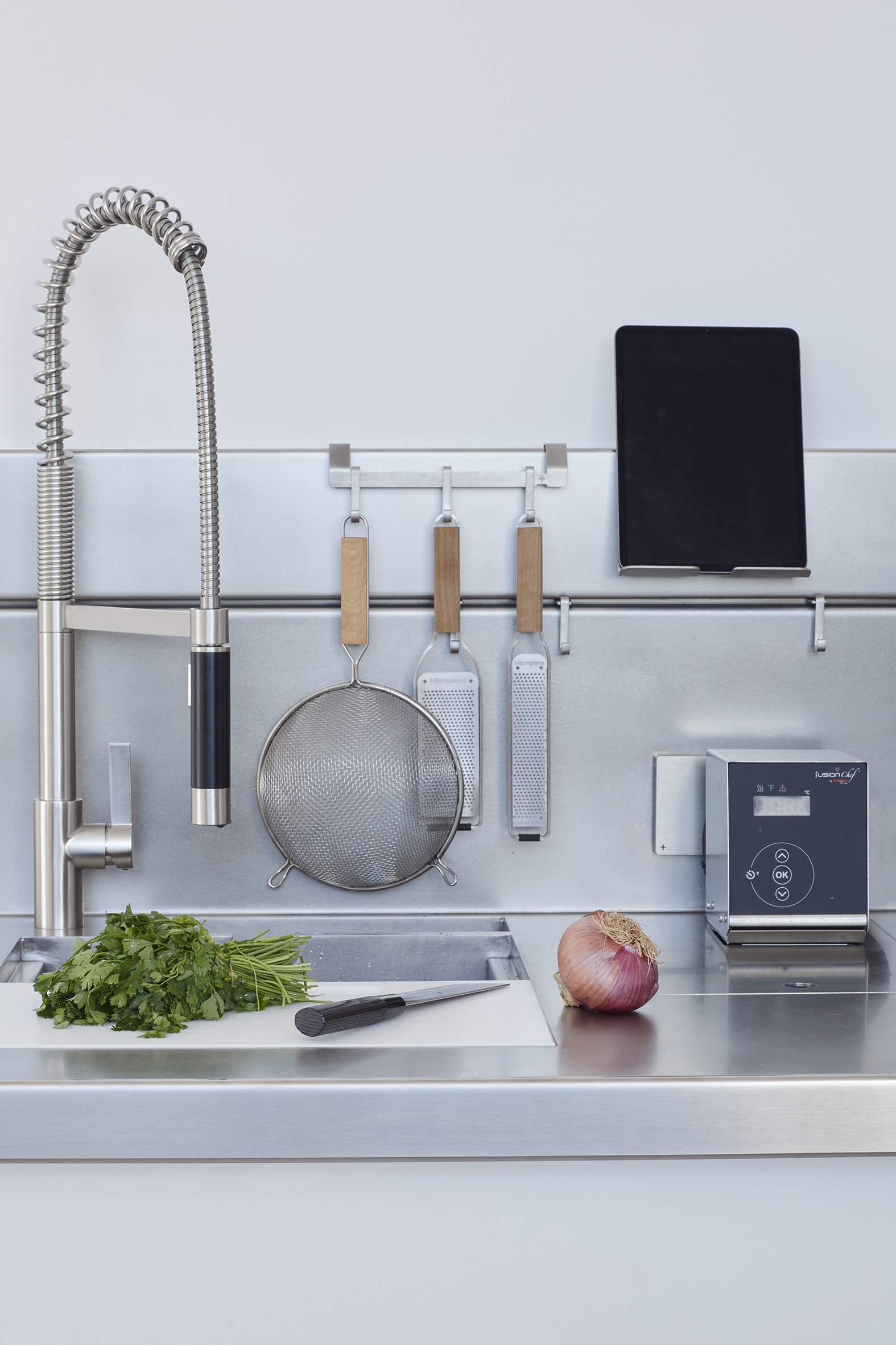 The wash section is the start of the process: a sliding board to clean vegetables, fish and meat; below this is an integrated basket to hold the cleaned produce with full handwashing facilities set at the rear, with a Dornbracht water tap and flexible hose to make all these processes easy; sous vide is conveniently situated next to the sink.