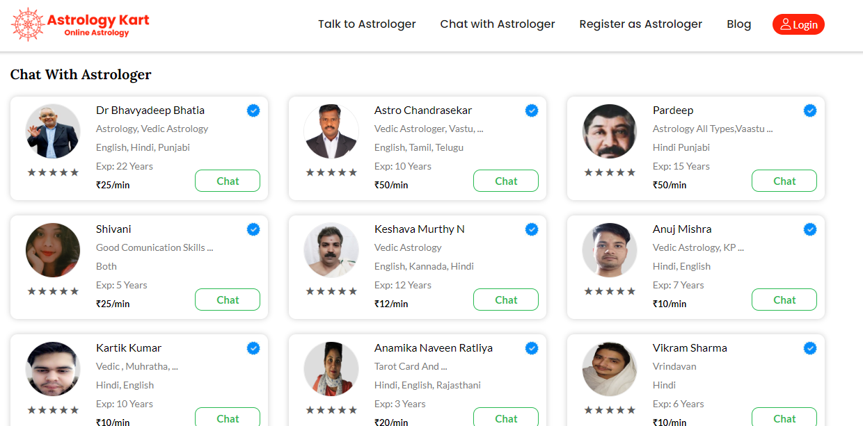 Astrology Kart will connect users with leading astrologers to talk to them or chat with them at the most affordable prices. It is our platform's policy to acknowledge that customers want privacy and convenient access to their preferred astrologers. Customers can contact numerologists, Tarot readers, western astrologers, and Vastu experts seven days a week. Our 150+ well-known experts have helped more than 6,00,000 clients and offered personalized consultations worldwide since we launched Astrology Kart in 2018.