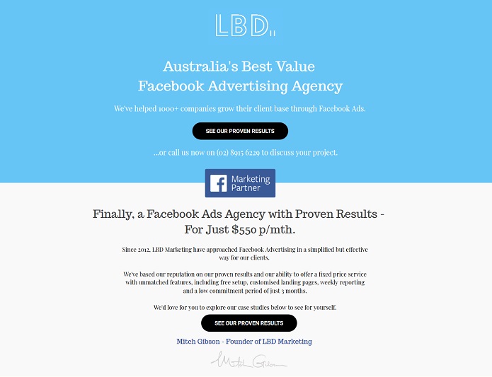 Being a facebook advertising agency that's excited about helping its clients surpass their goals and exceed their objectives, LBD Marketing worked hard to make sure its new site would be a platform to share and showcase the success stories of LBD Marketing clients above all else. New clients can book a 30 minute ZERO OBLIGATION facebook advertising consultation to discuss how Facebook Ads could benefit your business.