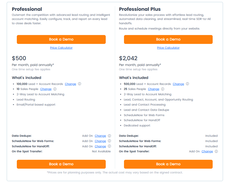 Companies can customize their plans by adding only the features they need, ensuring they pay for what truly benefits them. If you’re refining your lead routing strategy, the Professional Plan is a great starting point with the option to upgrade as your business grows.