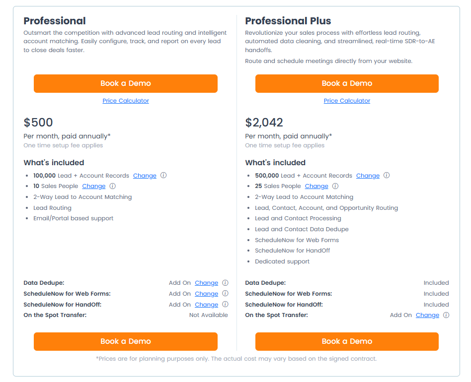 - Professional – For growing businesses looking to improve their lead assignment process without complex configurations, this plan includes core lead routing features, automated matching, CRM integrations, and basic analytics.