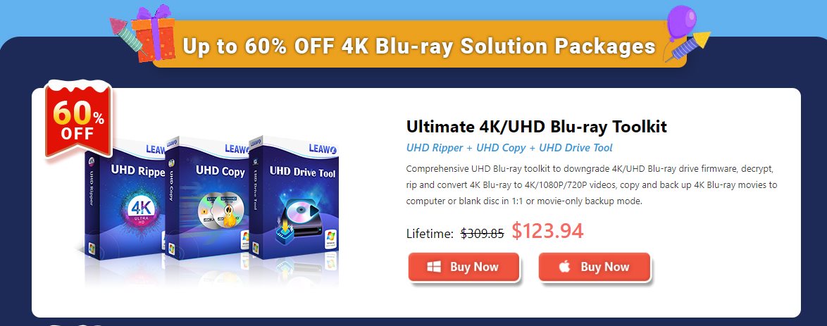 Leawo Ultimate Blu-ray Toolkit is a powerful bundle, consisting of UHD Ripper, UHD Copy, and UHD Drive Tool. This Comprehensive UHD Blu-ray toolkit to downgrade 4K/UHD Blu-ray drive firmware, decrypt, rip and convert 4K Blu-ray to 4K/1080P/720P videos, copy and back up 4K Blu-ray movies to computer or blank disc in 1:1 or movie-only backup mode.